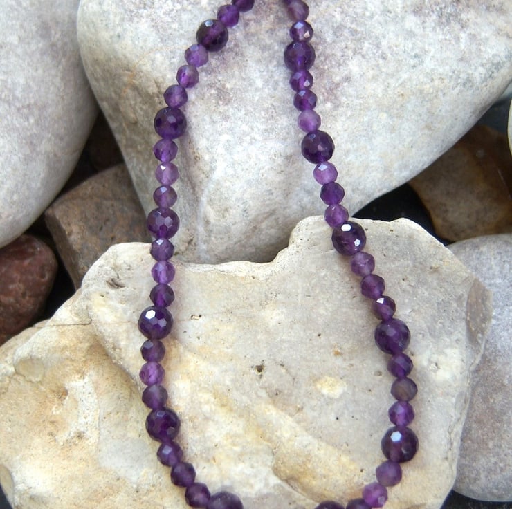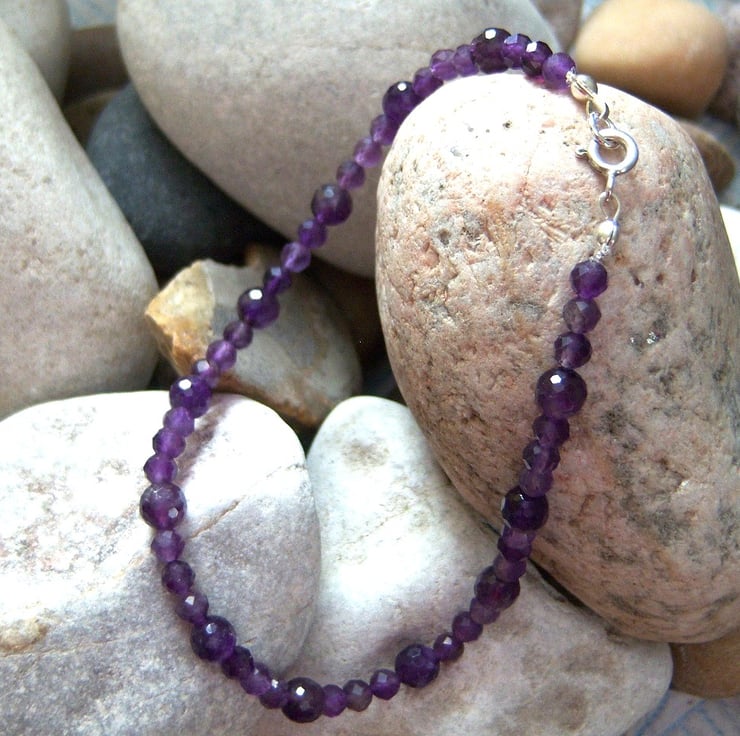 An anklet made up of 4mm and 6mm faceted amethyst stones on double nylon wire for extra strength. Finished with sterling silver findings and clasp. 25cms/10inch length.