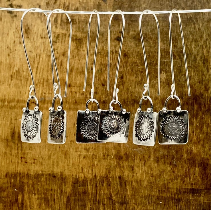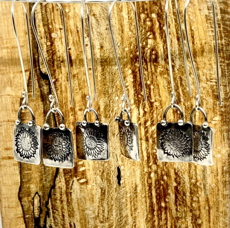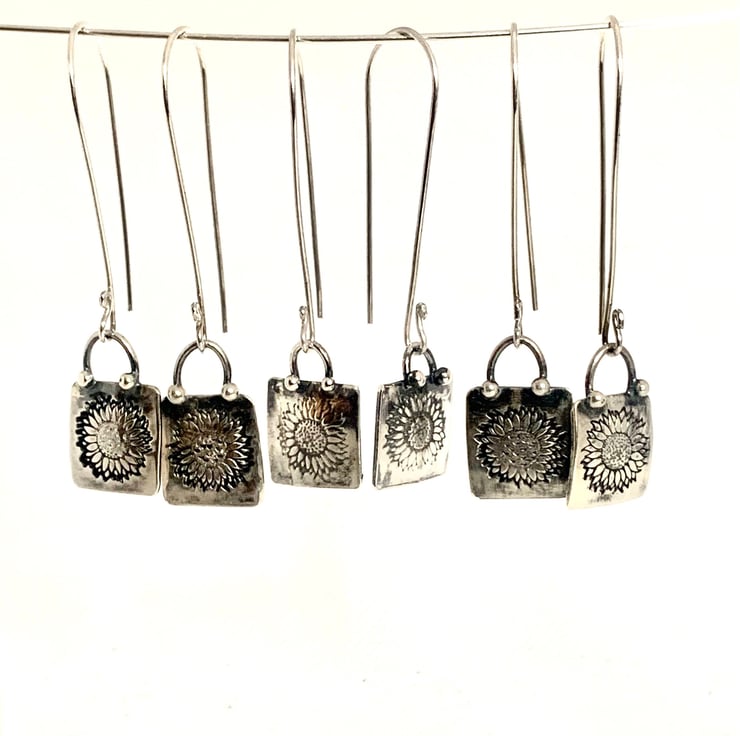 These Unusual Earrings are made from Sterling Silver. Handcut and stamped with a Sunflower Design using traditional methods. Each earring has a loop soldered onto it with two granulated balls the earrings have then been oxidised to enhance the pattern