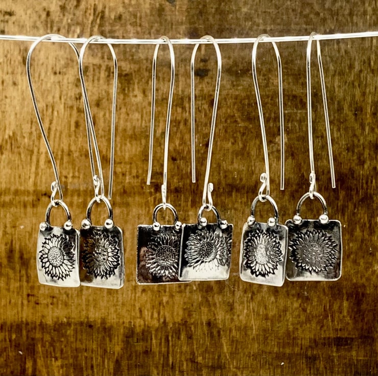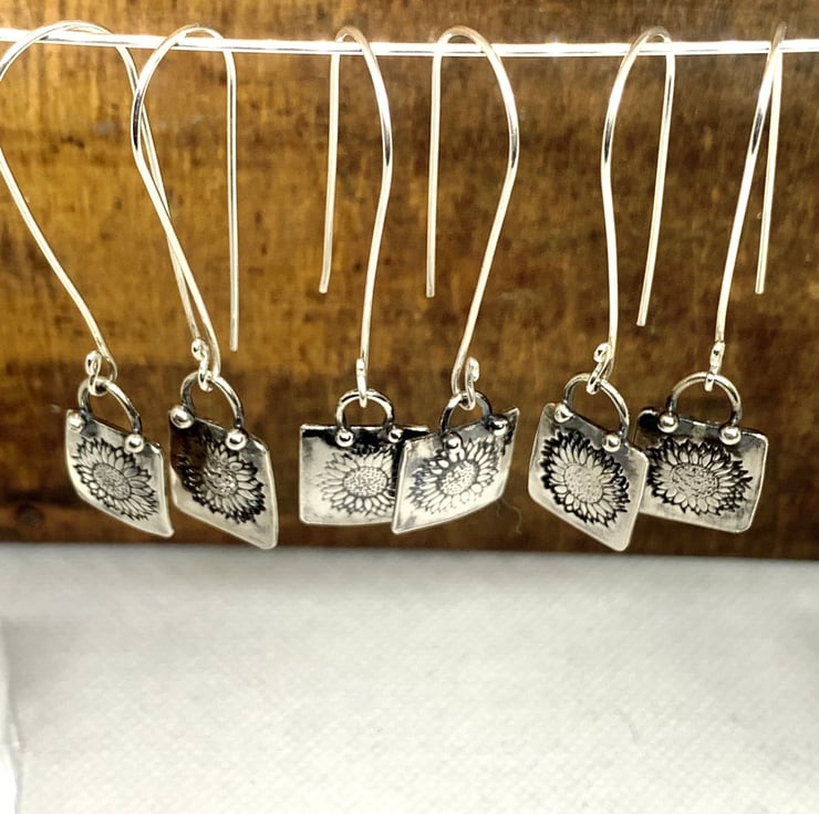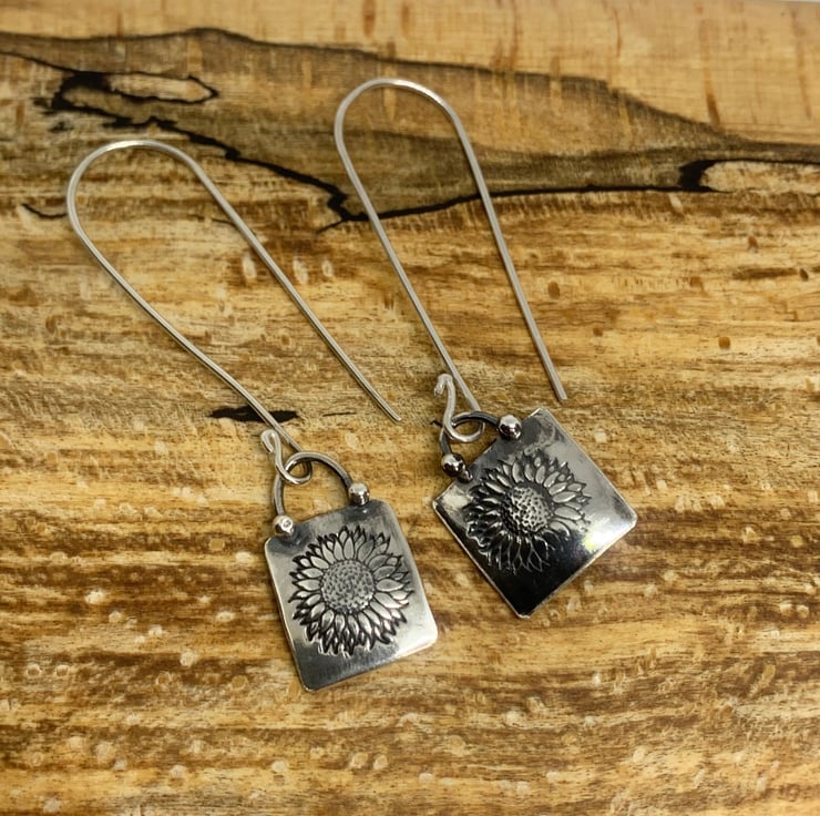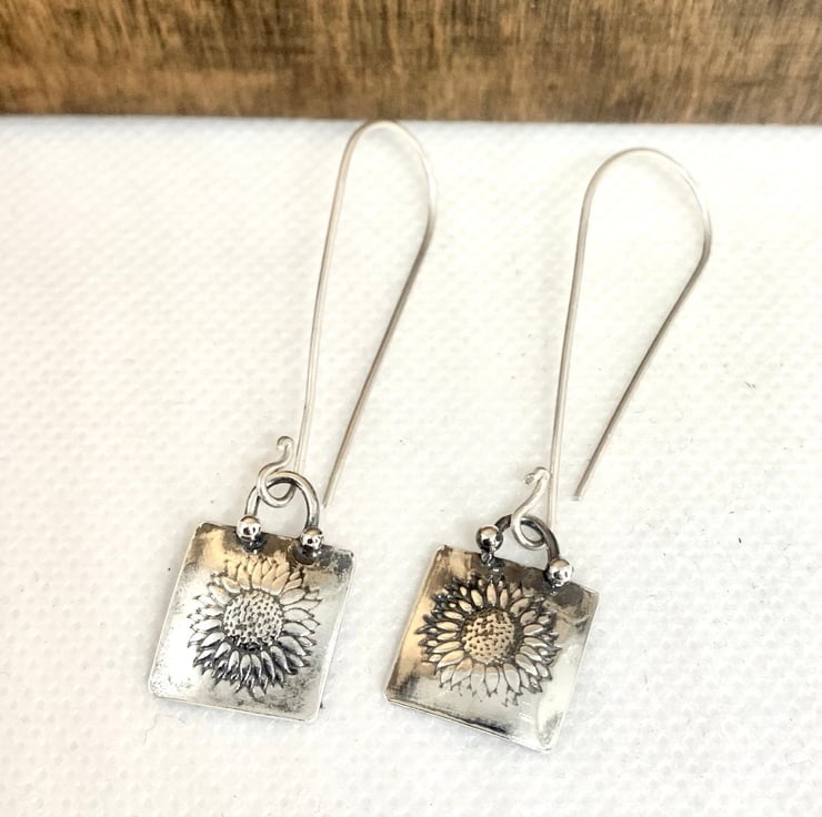 Sterling Silver Sunflower Earrings. Square Sunflower Earrings, Silver Earrings Floral Earrings, Long Drop earrings