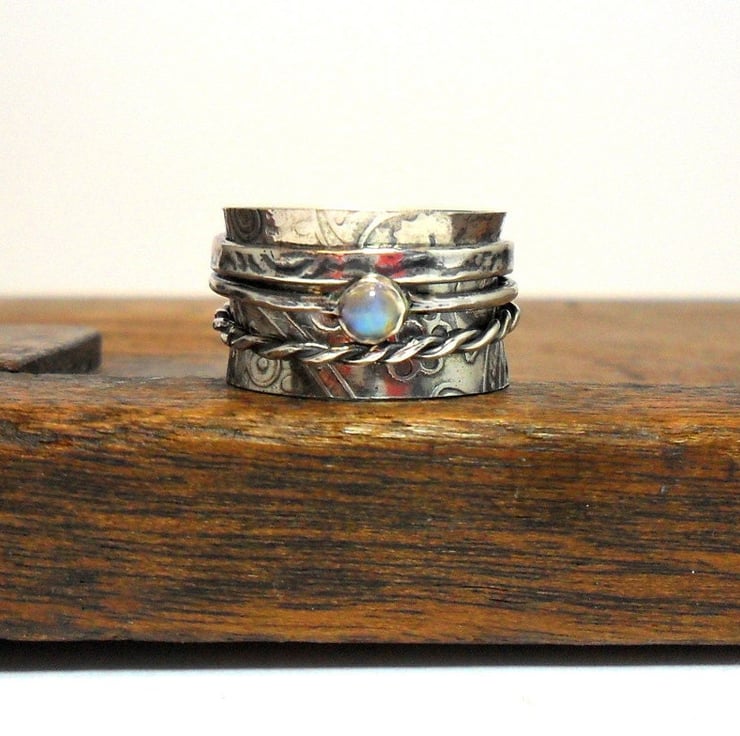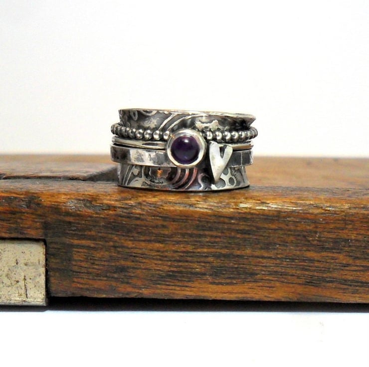This spinner ring is flared on either side to capture the 3 rings within. The rings have movement and can spin around the larger ring. It is also known as a worry ring or meditation ring.