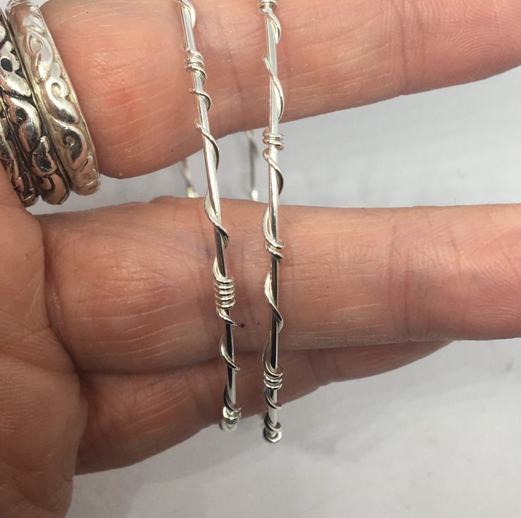 These entangled hoops come in several sizes. They are made from 1mm silver wire that is slightly thicker than the normal 0.8mm ear wire but should be ok for established holes