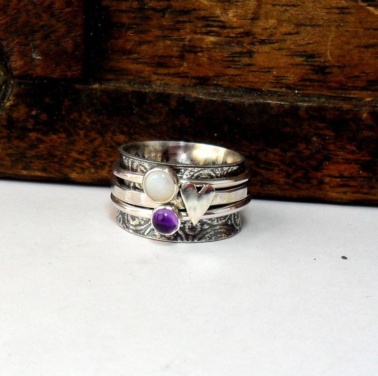 This spinner ring is flared on either side to capture the 3 rings within which are Opal and Amethyst and a heart ring. These rings have movement and can spin around the larger ring.