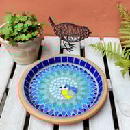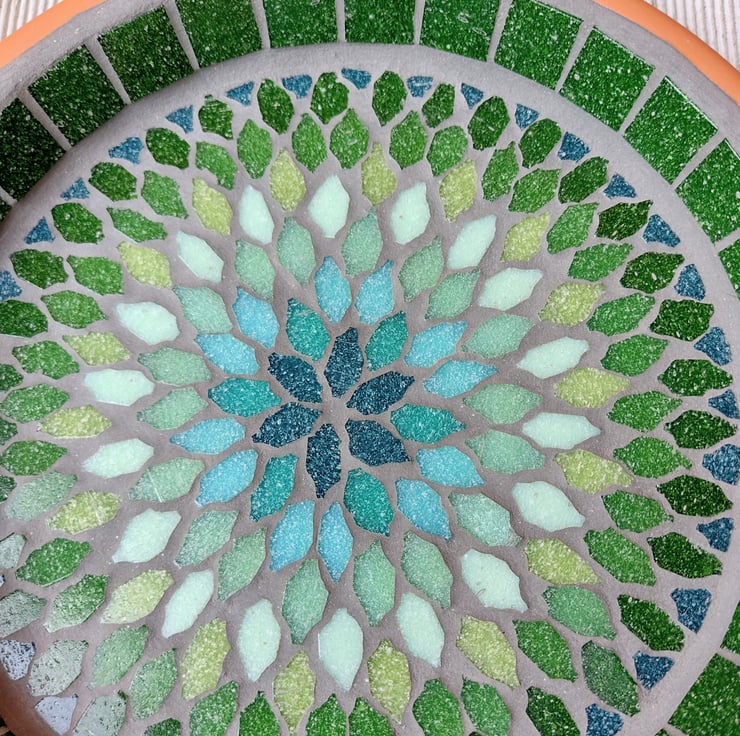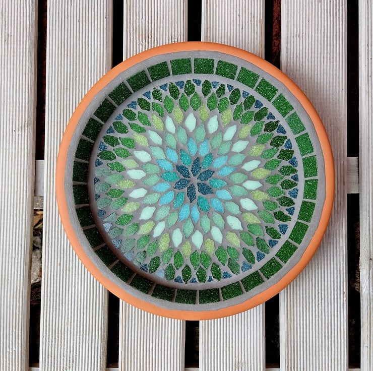 A 25cm (9.75 inch) diameter terracotta saucer with a mosaic made with glass tiles and a grey grout designed to repel algae and mould.