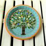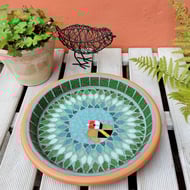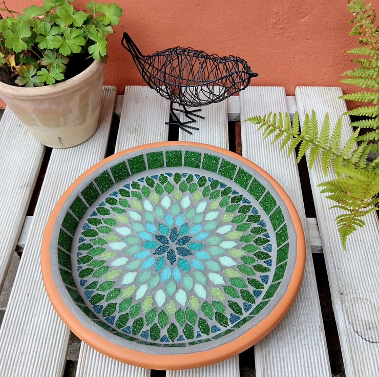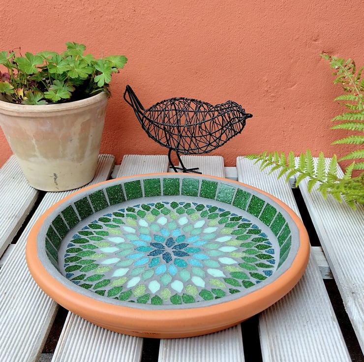 There's a lovely calming feel to this mosaic bird bath with a design which feels like looking up through a forest canopy. The design uses shades green including apple, mint, sea, jade and leaf then it is finished with a deep emerald green on the rim.