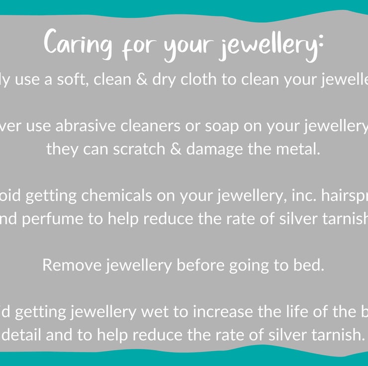 To help keep your earrings looking at their very best, clean them with the included polishing cloth, avoid exposing them to abrasive cleaners, chemicals (e.g. perfume and hairspray), and keep them away from water. Your jewellery should be the last thing you put on when getting ready and the first thing you take off at the end of the day/night.