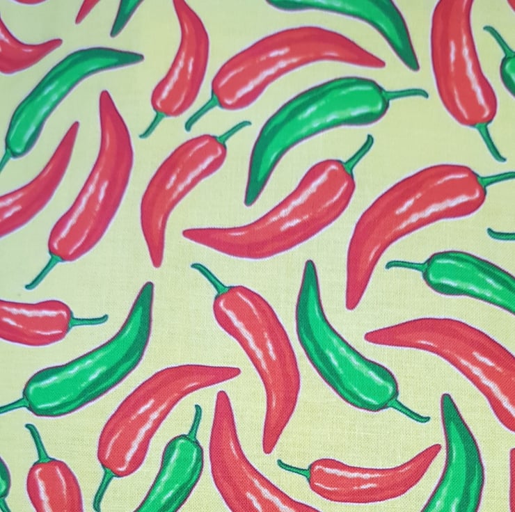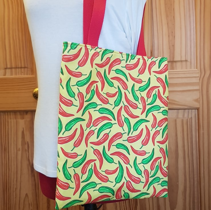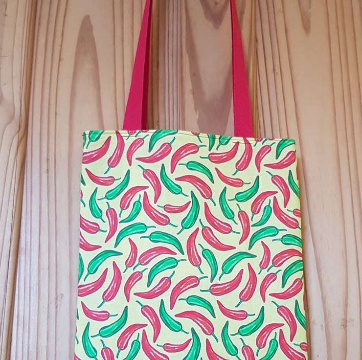 This striking cotton tote bag will get you noticed in the super market! The chilli design is by an independent designer and is a good quality cotton. The bag is fully lined with a coordinating cotton and I have added a small inside pocket. The straps are made from a strong cotton herringbone tape and I have added some additional stitching to secure them them to the bag. The bag can be folded flat and popped in another bag.