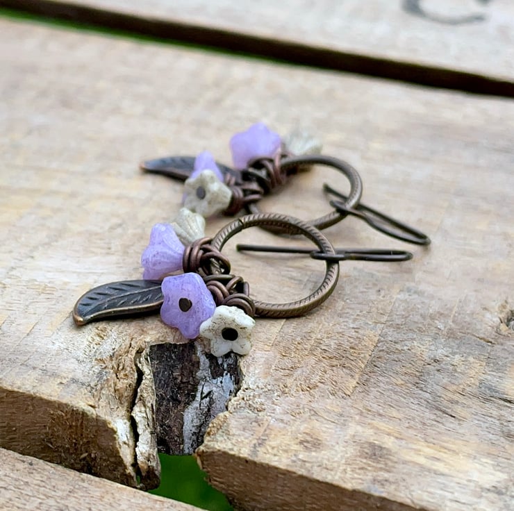 They are surrounded by wire wrapped Czech glass bell flowers in delicate shades of lilac and cream. The cluster of beads simply dangle from ribbed Vintaj brass rings, giving the earrings lovely movement.