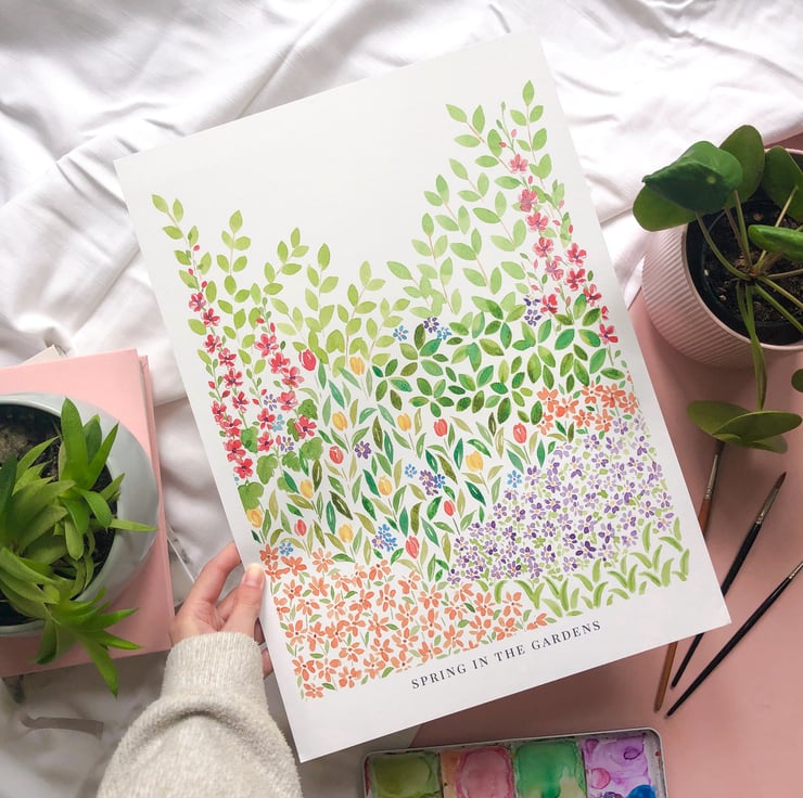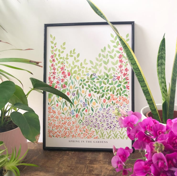 Spring In The Gardens: recycled art print inspired by the bright colours of spring flowers! Originally hand painted with watercolour to capture vibrant tulips & greenery.