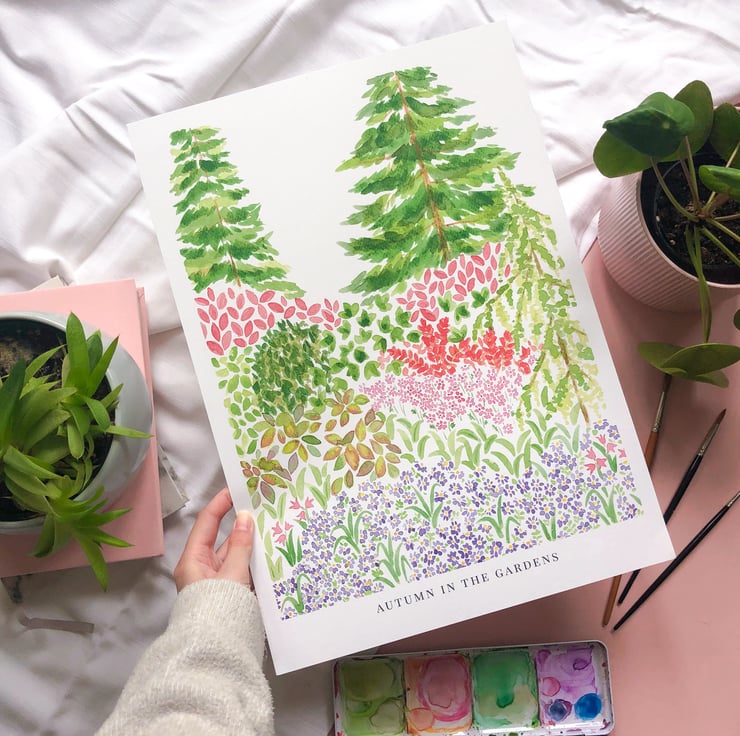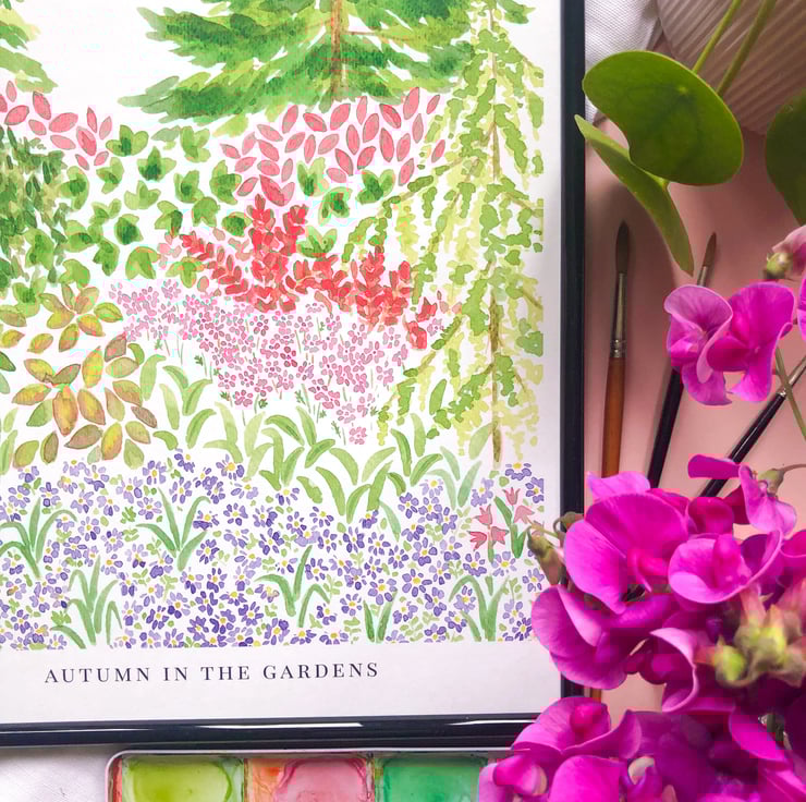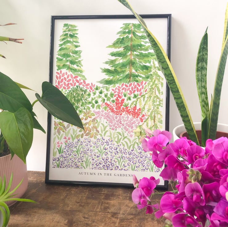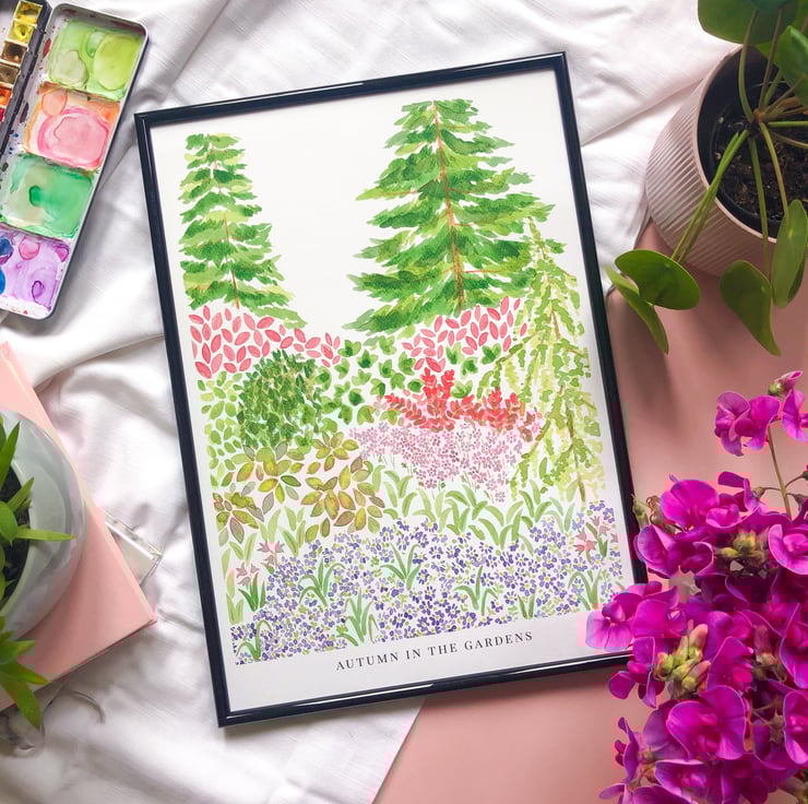 Autumn In The Gardens: a recycled watercolour print inspired by the warm & vivid colours that appear when fall is near! Originally hand painted with watercolour to capture the gentle yet vibrant colours of autumn, inspired by RHS Garden Wisley.