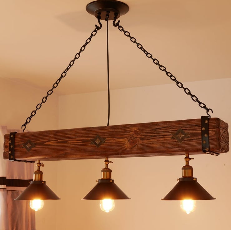 Industrial Style Wooden Beam Chandelier with chains for 3 pendant lights.