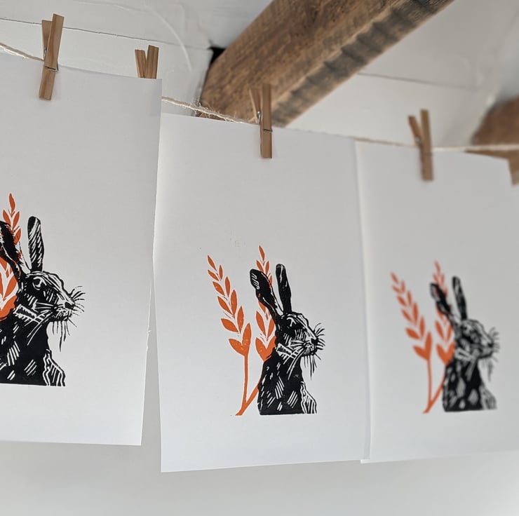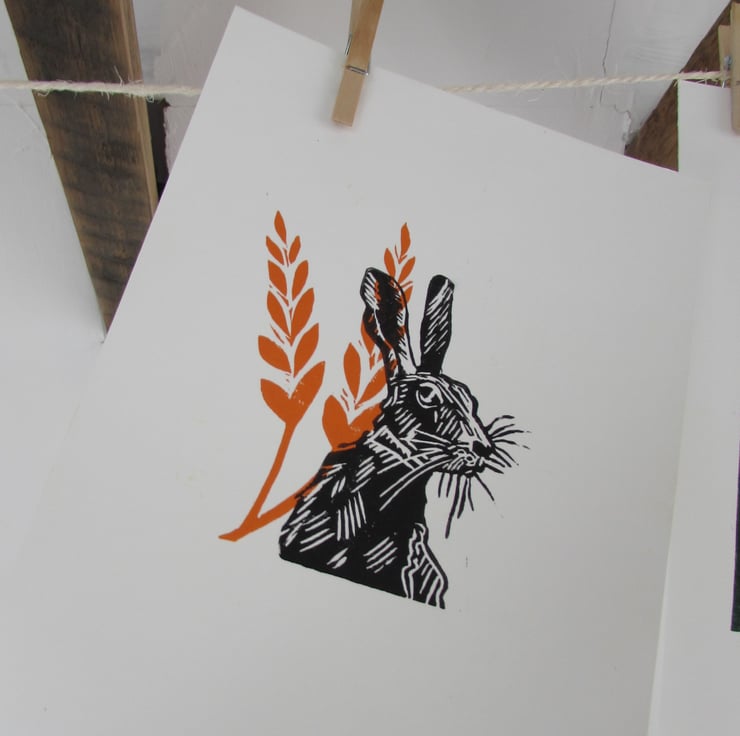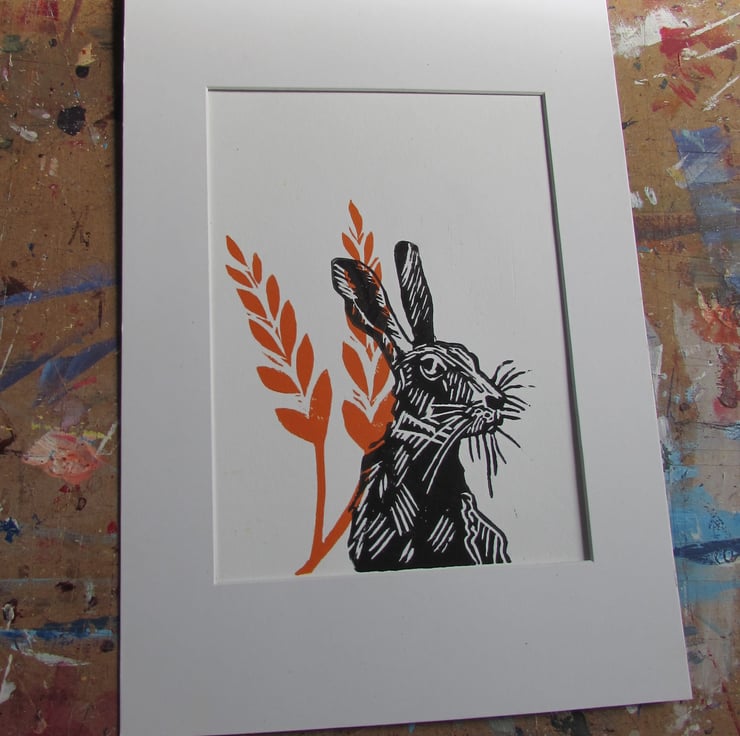 A hand made hand burnished, linoprint 'Harvest Hare'. The process results in small changes to each print so every print is unique. The inspiration for all my work listed is from travel, nature and the natural world and this one shows a proud Harvest Hare in wheat. Hand printed using high quality acid free paper and printing inks, and designed to easily fit an A5 aperture mount ( usually 148 x 210 mm) and frame. Also suitable for a 6"x 8" aperture mount in a standard 8" x 10" frame. Unmounted and unframed - Posted in a hard back package for safe delivery with Free UK shipping.
