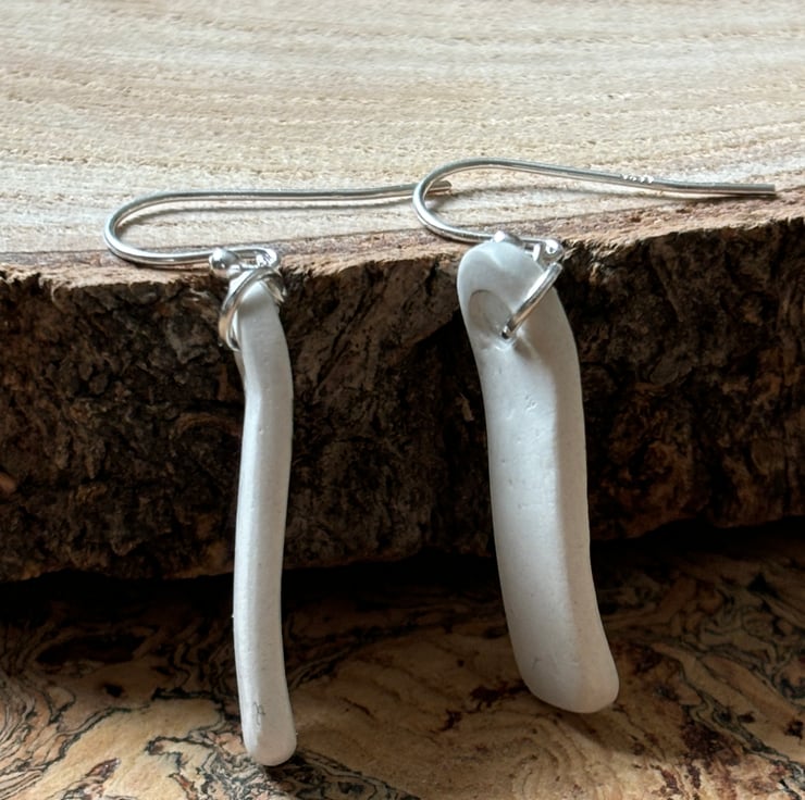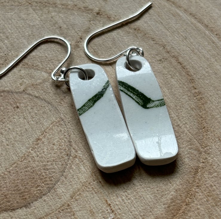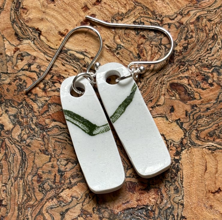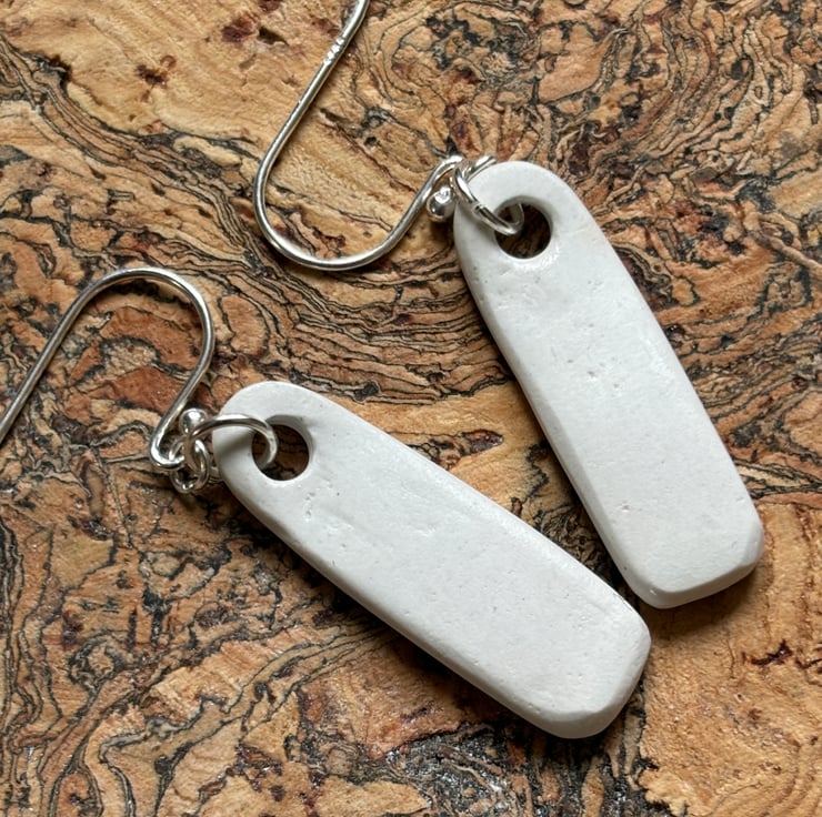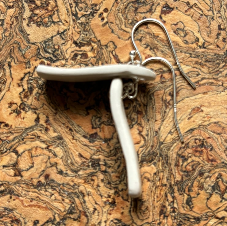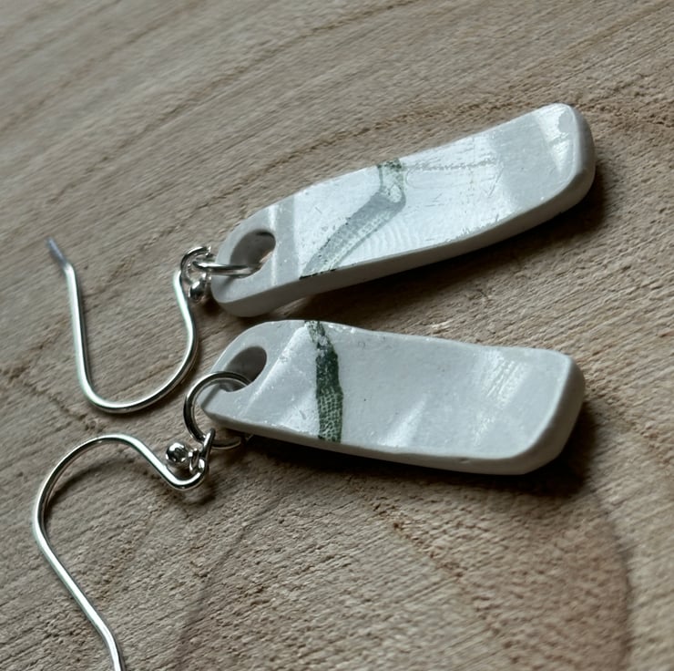 These earring are created from the rim of the larger piece. I drilled holes and sanded sides and backs, intentionally leaving the surface slightly uneven to preserve character. Front glaze intact but has scratches. Sealed with non toxic eco friendly matt sealant.