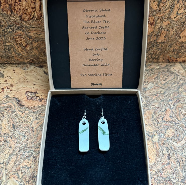 Hand crafted Jewellery and framed artworks using pre loved and discarded ceramics. Ceramic material will show signs of wear and damage. Entire process is a creative experience from discovery to final picture, nothing planned or preconceived. All materials personally collected from river banks, charity shops, roadside, woods, recycle centres, beaches, wherever dropped, dumped or donated ceramics are found, cleaned and shaped into new stories. Each piece comes with a short bio of where the ceramic came from, date found and re-created. Some shards collected are used as found, others are cut randomly which shape the final work. Every piece is individual, nothing replicated, however, due to repetitive patterns in ceramics there will be some similarity but only through the ceramic material not in the final piece.