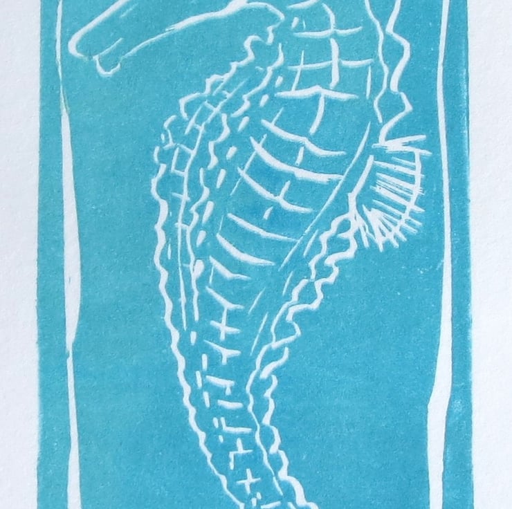 Handmade handprinted art card of a seahorse printed in turquoise ink. Perfect for sea lovers, beachcombers, mermaids and salty seadogs everywhere.