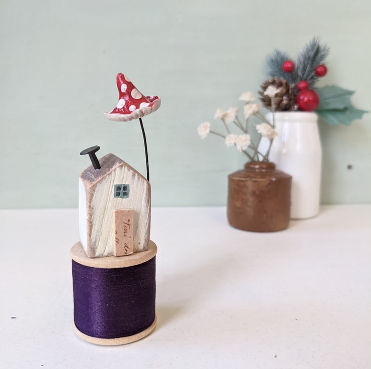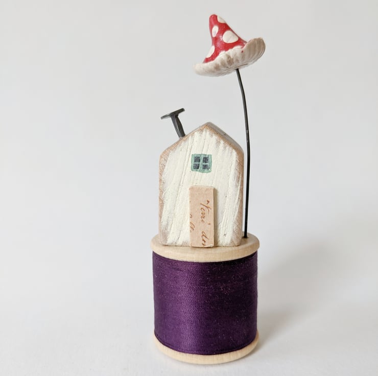 I love finding these old bobbins on rummaging trips! The tiny homes perch happily on top.