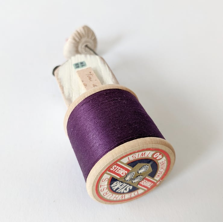The old bobbin is decorated with pretty thread, and hiding beneath is the original old vintage sewing label.