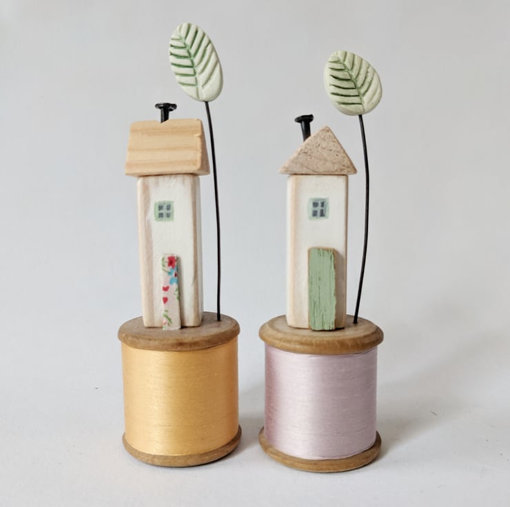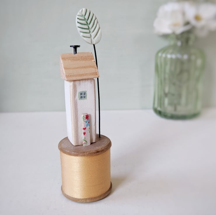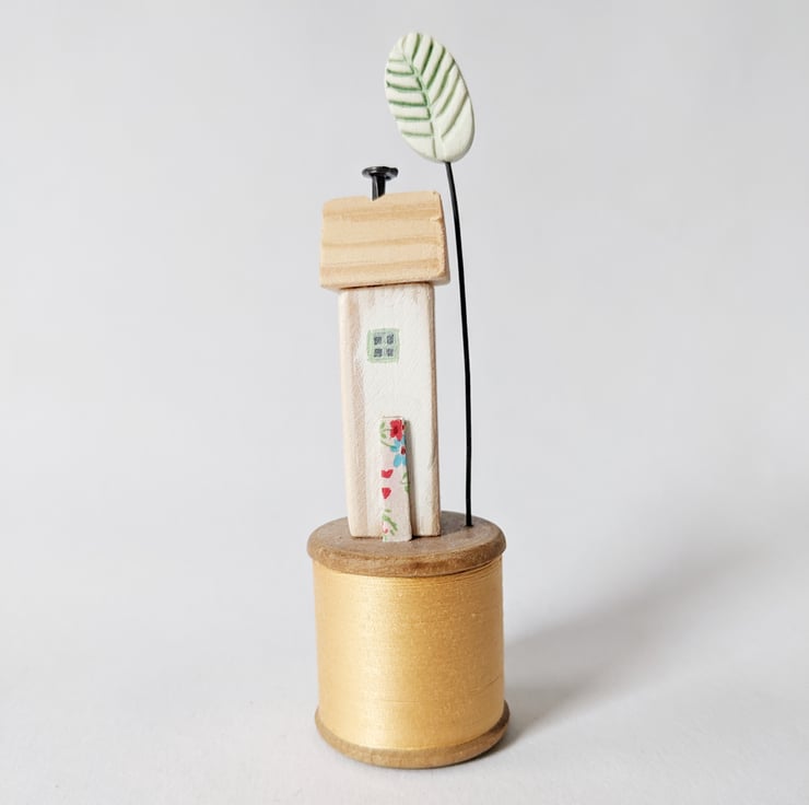 A hand painted little wooden house sits on a vintage bobbin. A patterned and painted clay tree stands beside it.