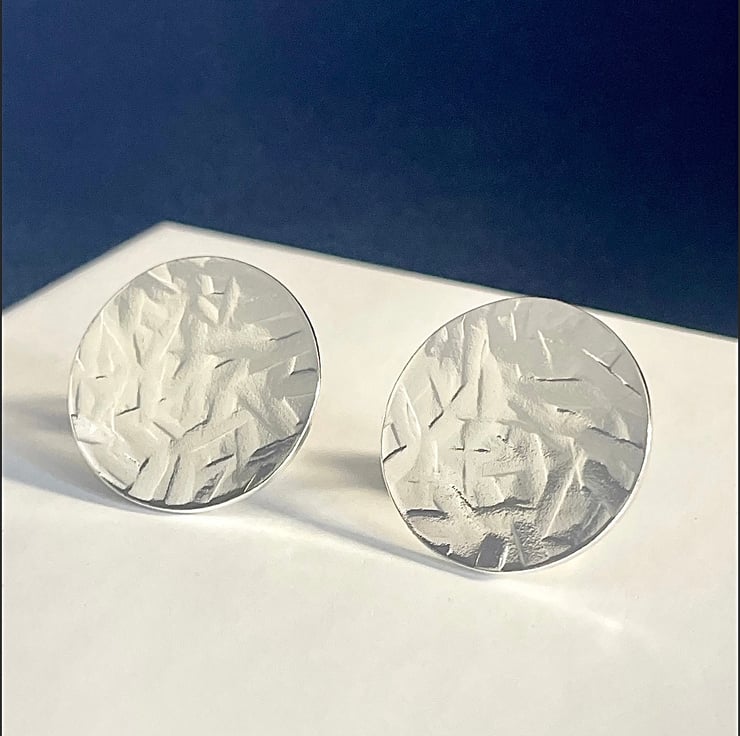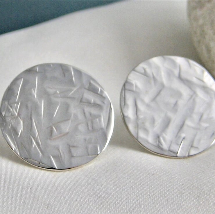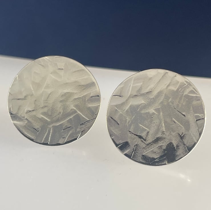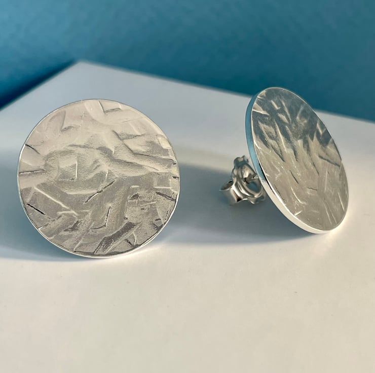 A lovely pair of large round disc ear stud earrings handmade from 925 sterling silver. Cut out by hand from solid 1mm thick silver sheet the round discs are then hammered to create their unique abstract patterned textured surface. They have long pin fittings (in the centre) and are secured with stamped (925) silver scroll’s/butterfly’s.