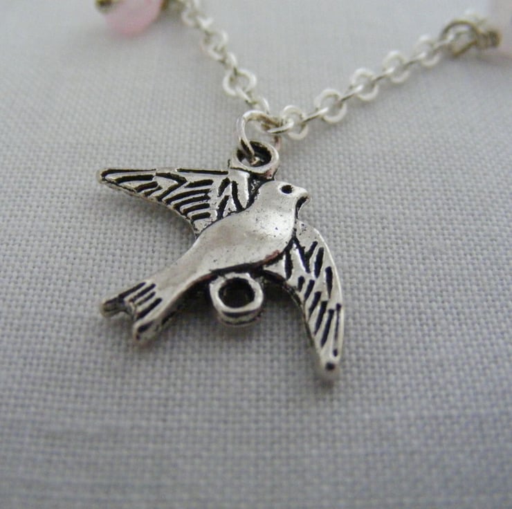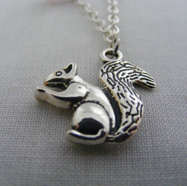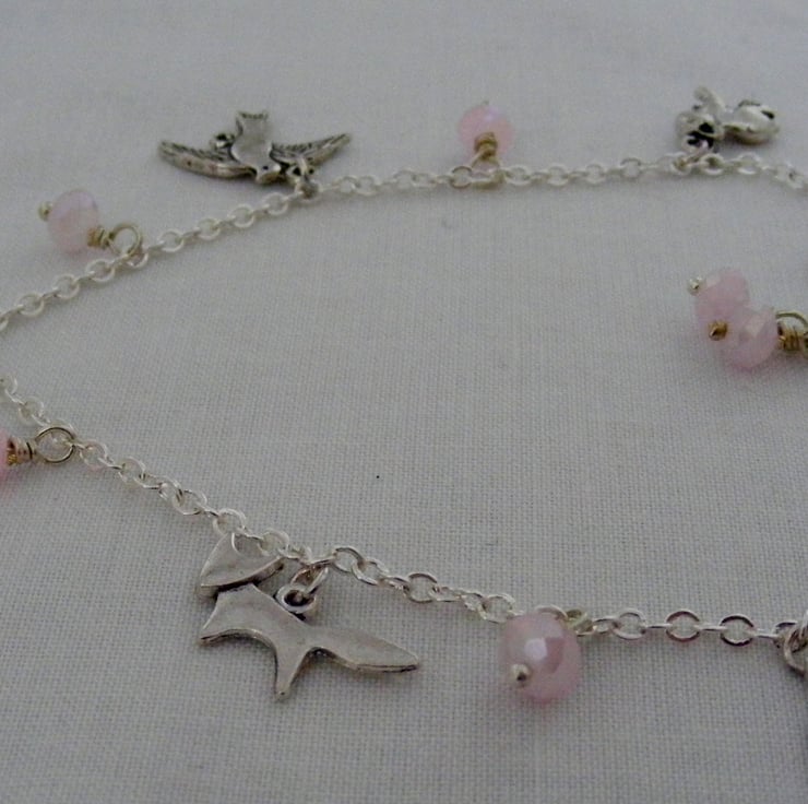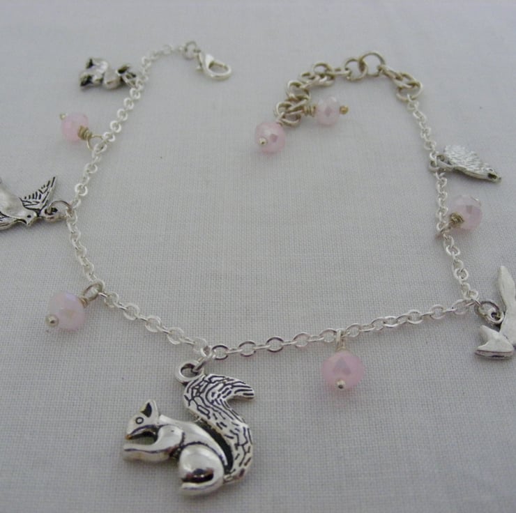20x10mm silver plated fox charm, 20mm silver plated squirrel charm, 18x20mm silver plated bird charm,10mm silver plated rabbit charm, 4x6mm soft pink faceted crystal rondelles, silver plated chain, lobster clasp and extension chain.