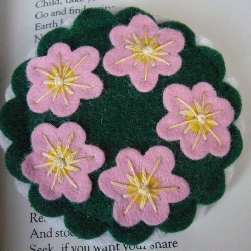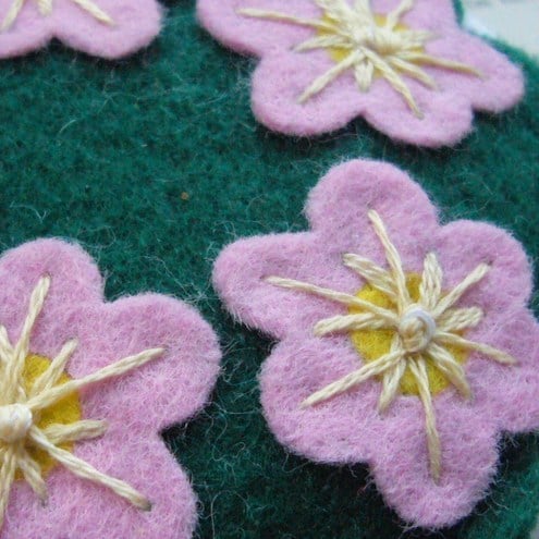 The flowers are sewn onto a 70mm green felt background which is stitched to a white felt backing piece - this has the 25mm brooch pin securely stitched to it. In between the layers is a little wadding and a circle of cardboard to stiffen.