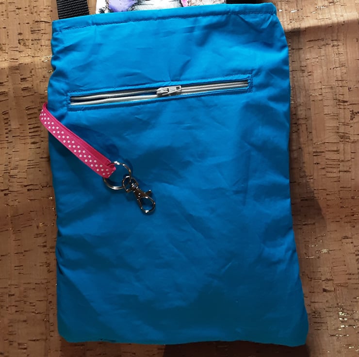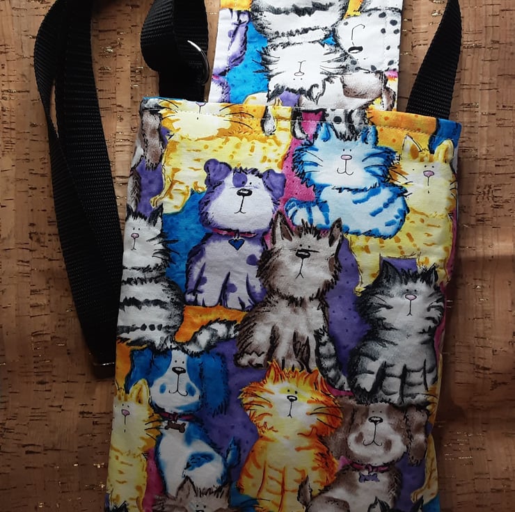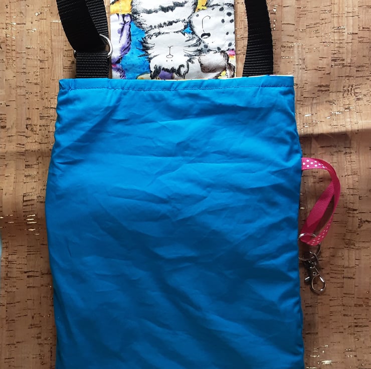 The front, back and pocket panels are made from multi coloured cat & dog print cotton fabric.