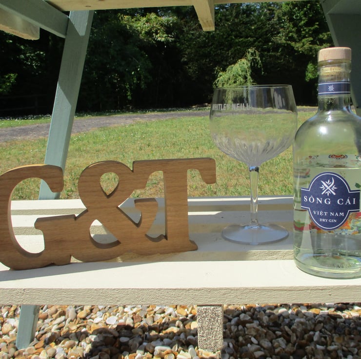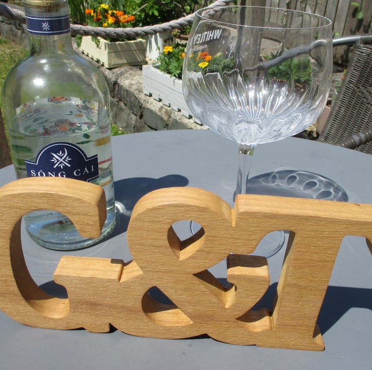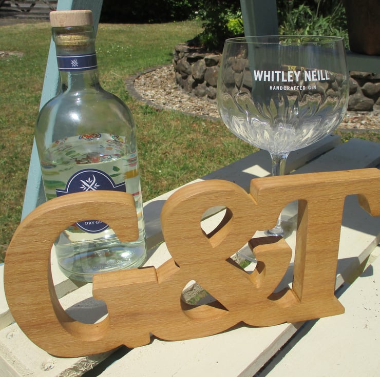 This wooden freestanding G&T sign is hand cut from a solid piece of hardwood and then given a light wax finish to enhance the wood grain.