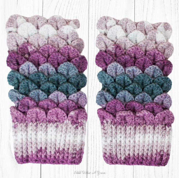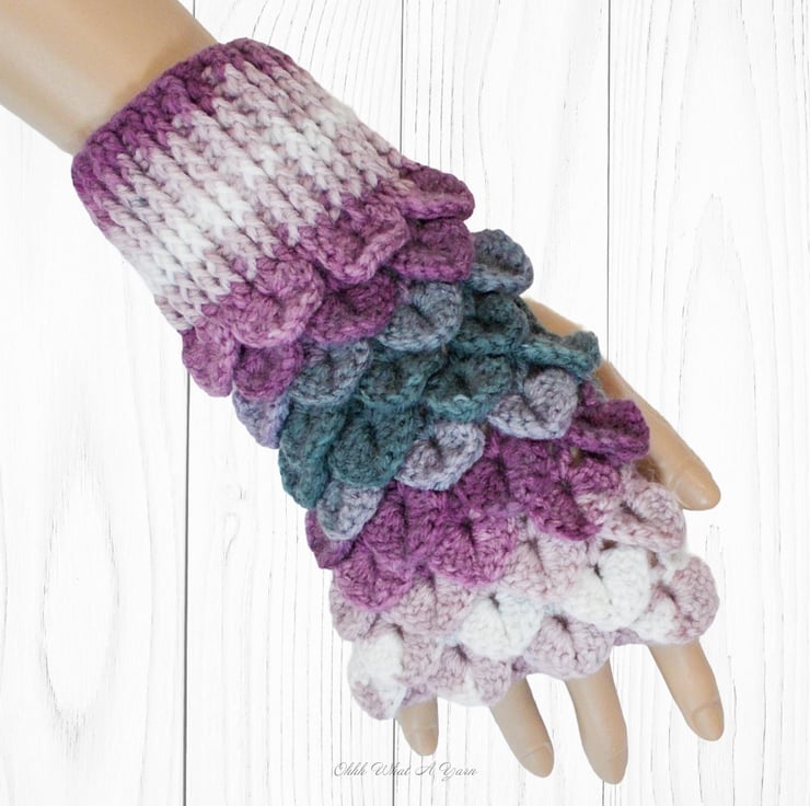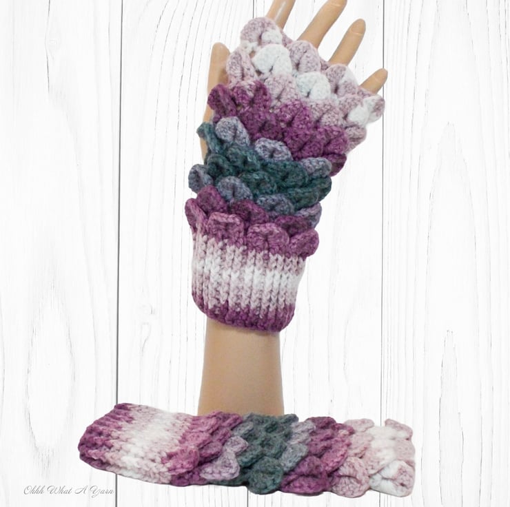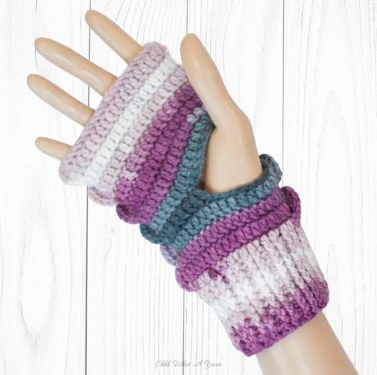 These cosy ladies fingerless gloves have been crocheted using a gorgeous colour changing yarn in shades of purple, lilac, grey and white. The yarn is 100% acrylic.