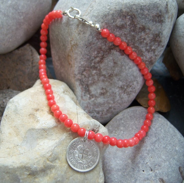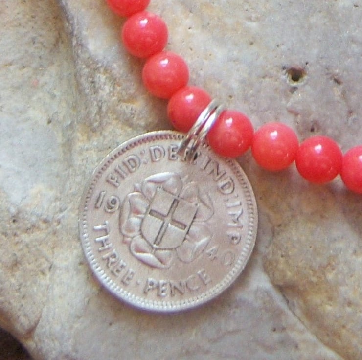 An anklet made up of 4mm round bamboo coral stones, on double nylon wire for extra strength. There is a old silver threepenny piece from 1940 as a charm. Finished with sterling silver findings and lobster clasp. 25cms/10inch length.