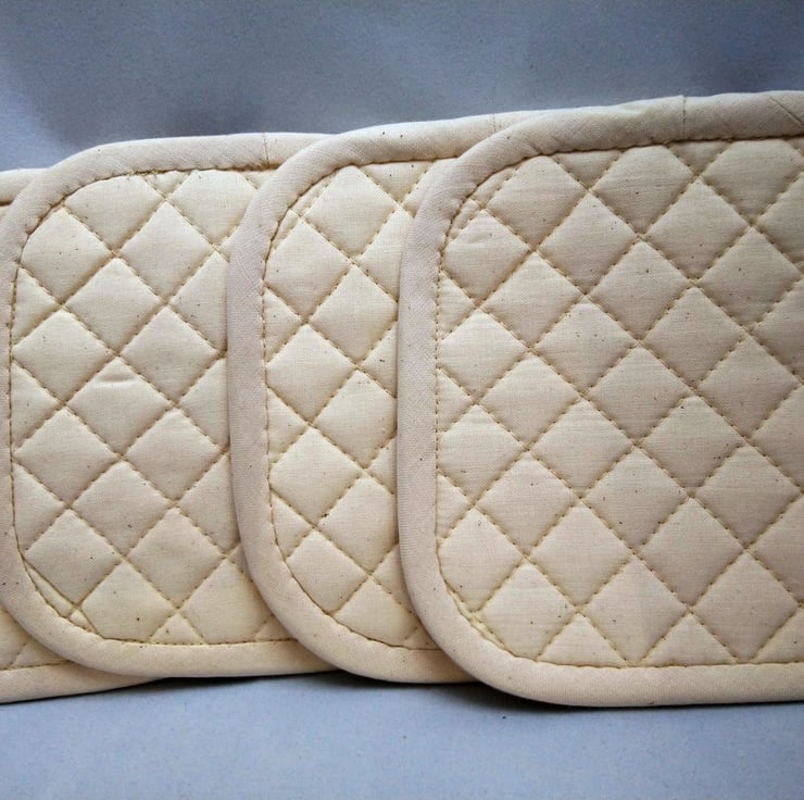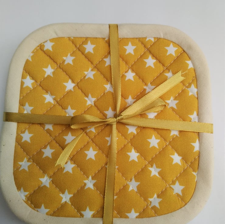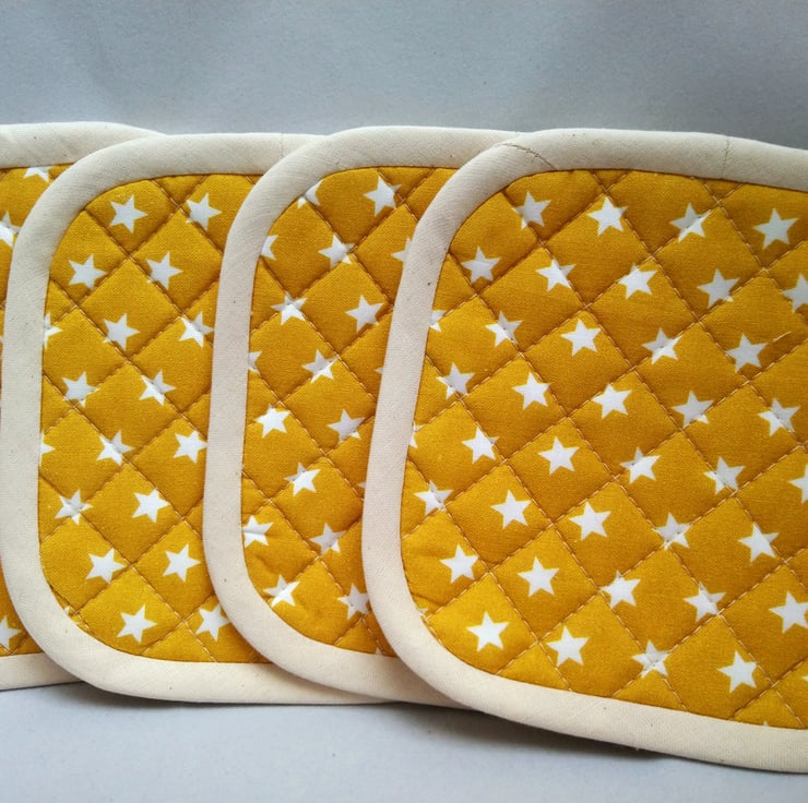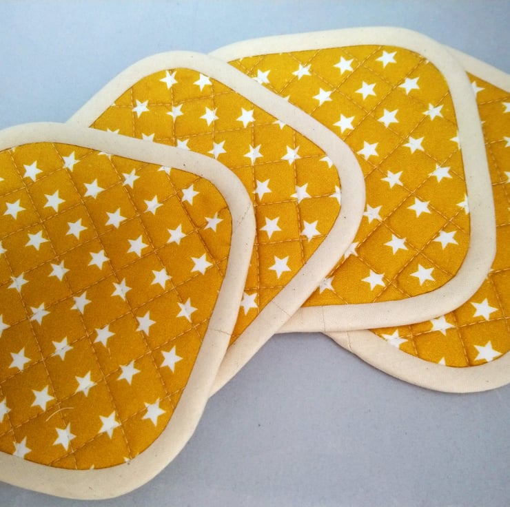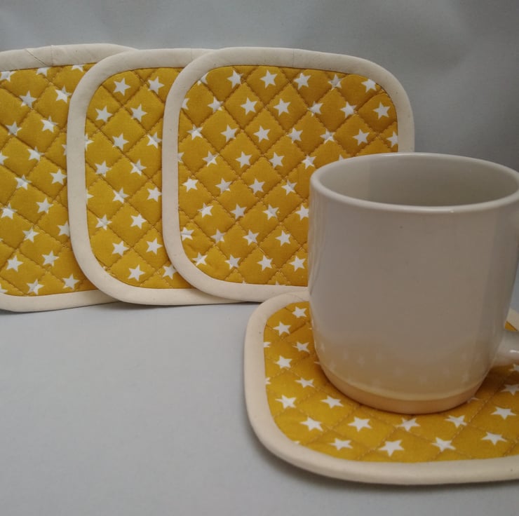 A Set of 4 Quilted Heat Resistant Coasters. These coasters have 2 layers of heat resistant wadding. Made from 100% cotton fabric. The reverse side and binding is cream cotton (calico). The binding is handmade and hand sewn to the reverse side.