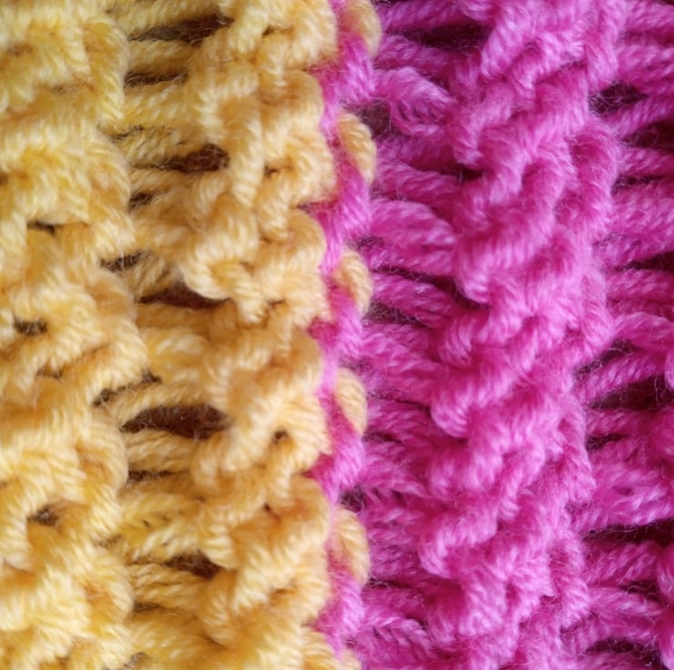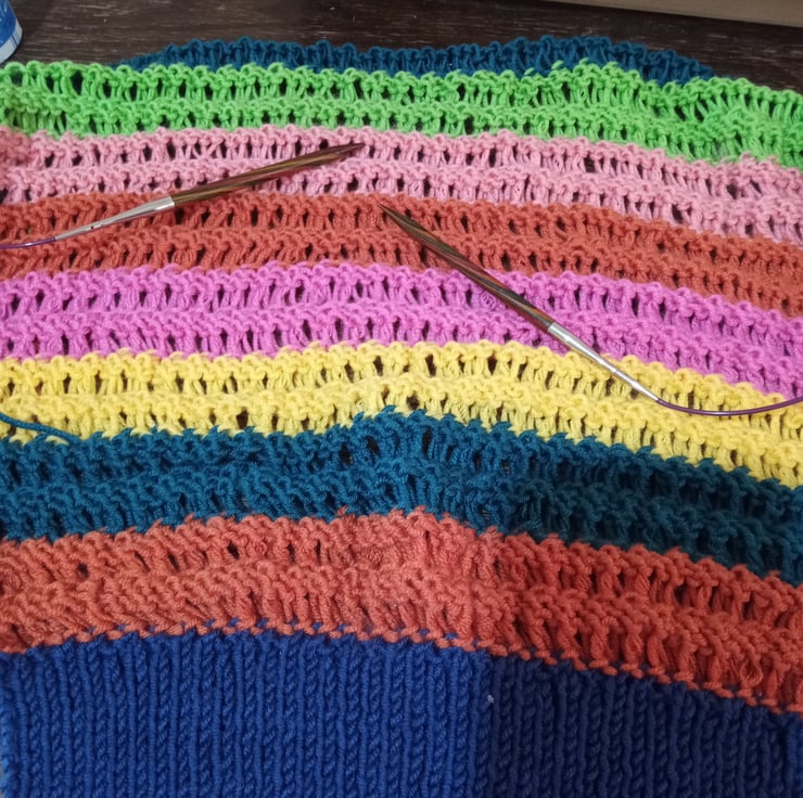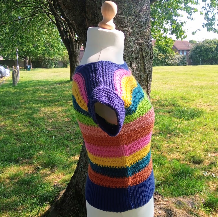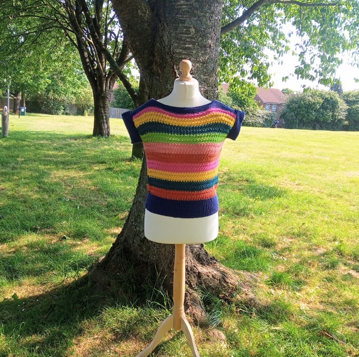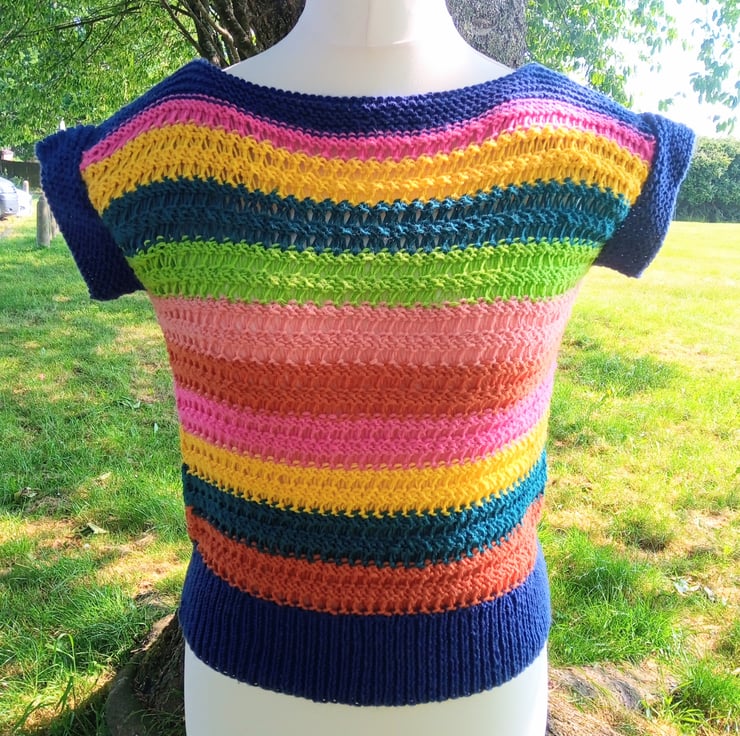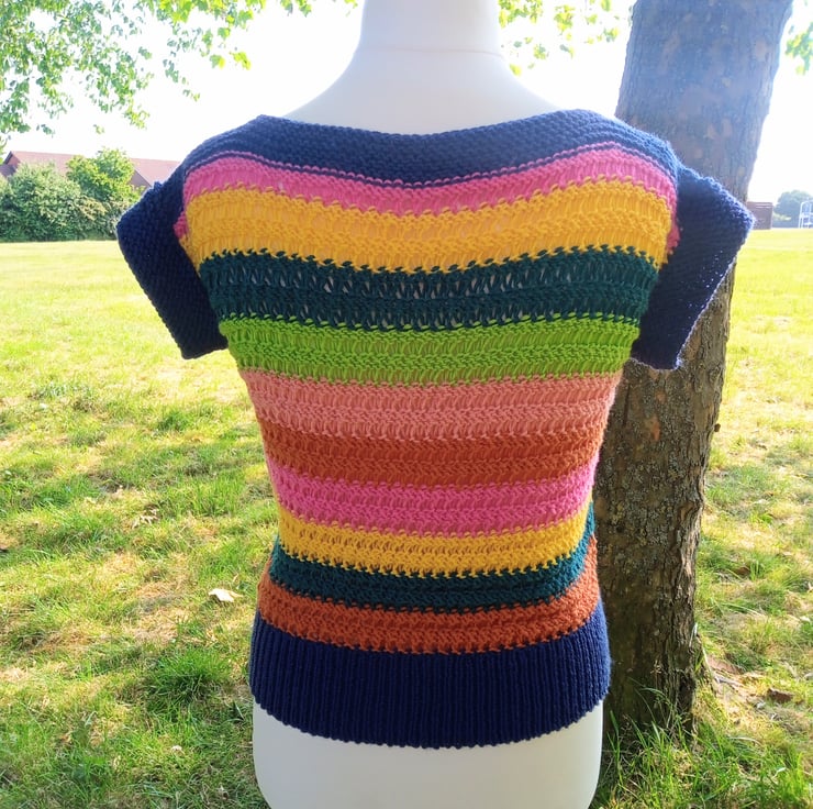 The pattern is simply called "Lady's Jumper" but would look good on anyone. The stitch pattern is interesting and well-defined and the boat neck is very flattering. It lookes amazing in the bright, soft stripes of the beautiful yarn. The yarn has a silky finish and eye-catching, clear, bright colours.