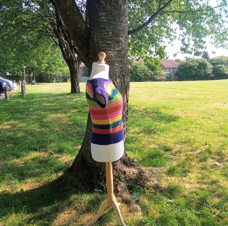 The mannequin I used for display was sold as a UK size 14. The bust of the model is 94cm/37" and the hip is 99cm/39 inches. The jumper has stretch and would fit slightly bigger if you like it tight (the pattern was for a 40 inch bust) and, of course, could be worn more loosely if you take a smaller size.