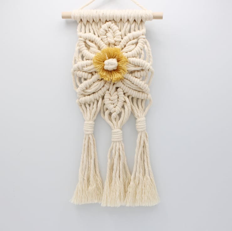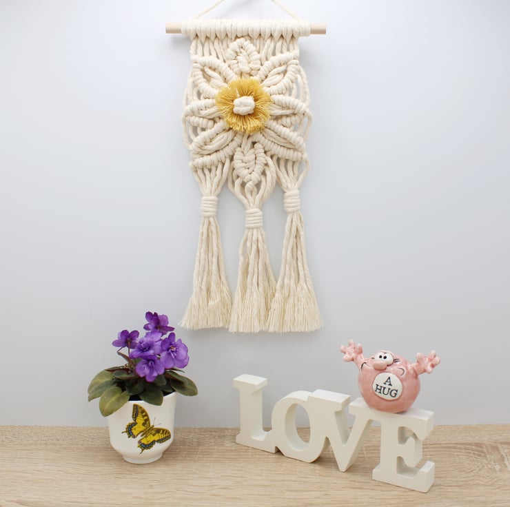 A small flower wall hanging which has been crafted to my own design in natural cotton string. a The centre of the flower is surrounded by a brushed out fringe of honey yellow giving a small hint of colour.