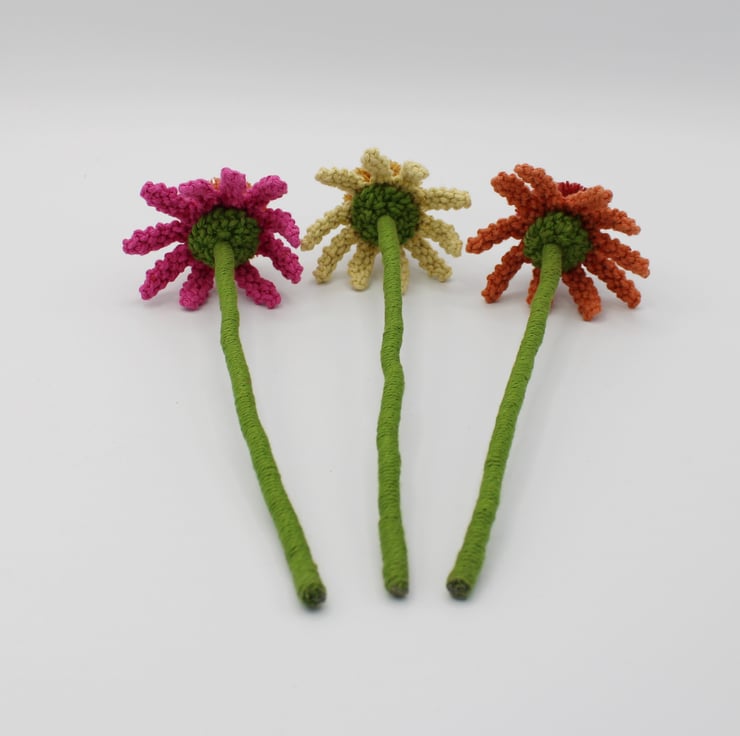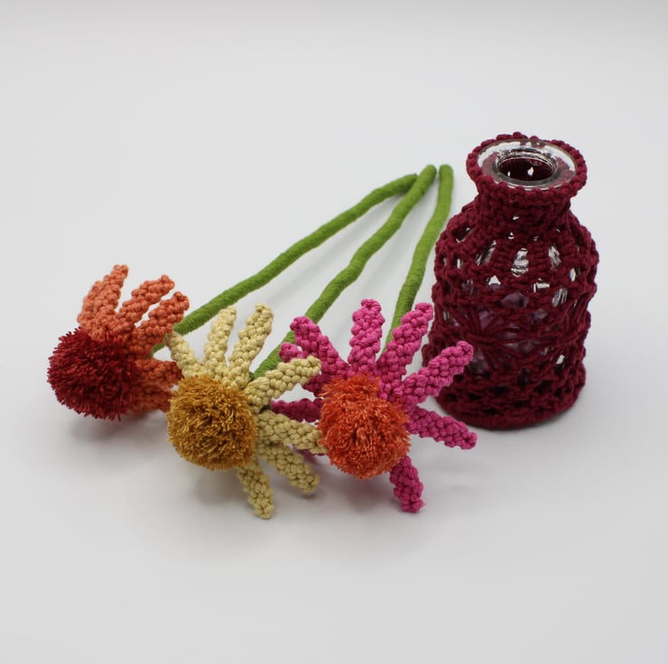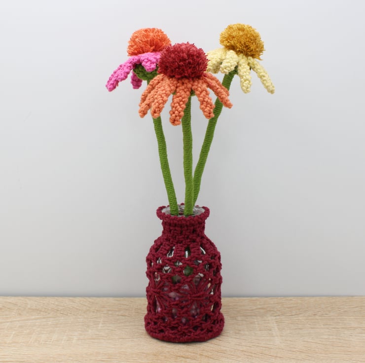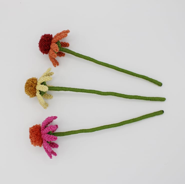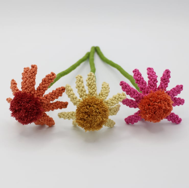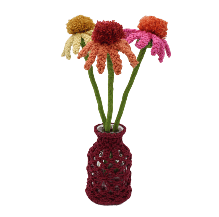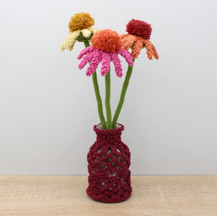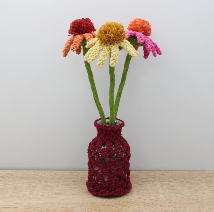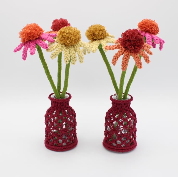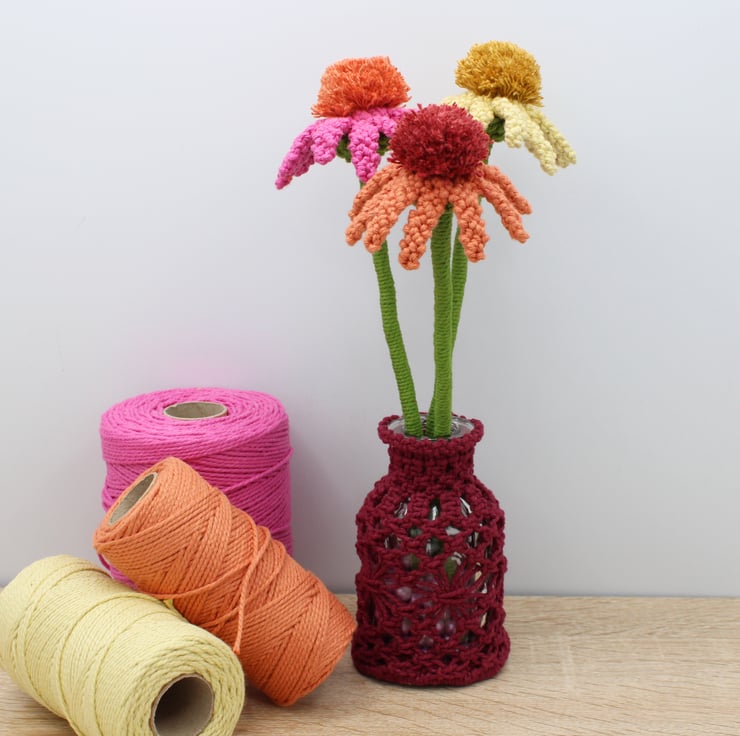 A trio of macrame Echinacea's in full bloom displayed in a vase to brighten your room. Made especially to order. Every petal of each flower has been knotted by hand before assembling together. Created using my own design, the flowers have been made in fushia pink, pale lemon and terracotta orange, They each have a pompom like centre characteristic of the real echinacea's