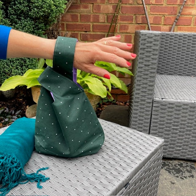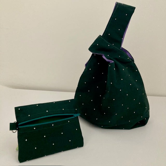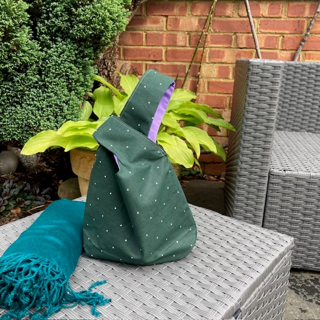 The outer fabric is a square white dots print cotton fabric on a dark green background with a contrasting purple plain cotton lining.