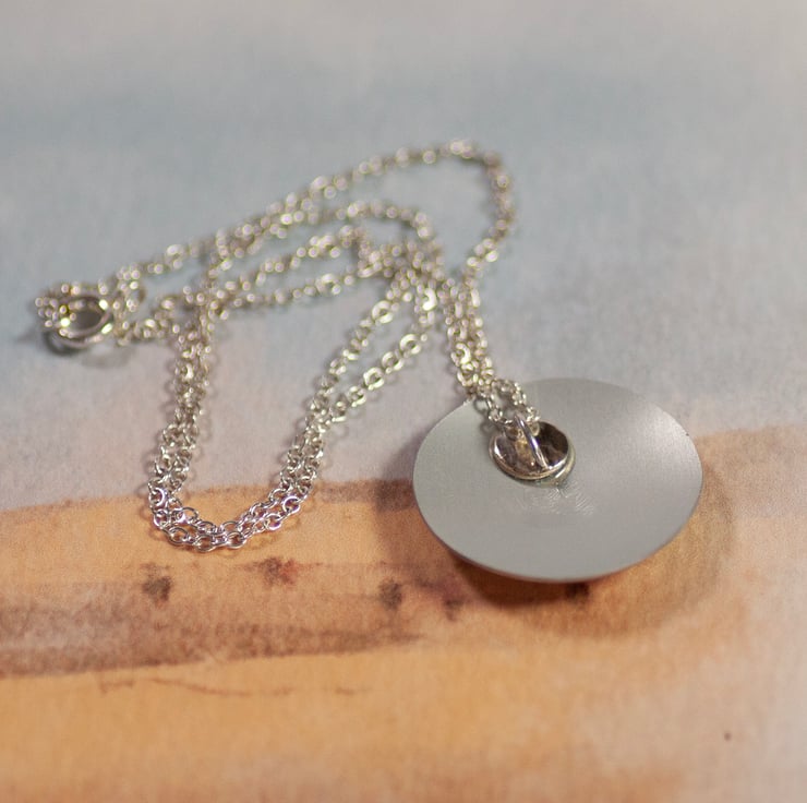 This lightweight anodised aluminium necklace is the colour of the sand and the sea with a plain aluminium colour back.