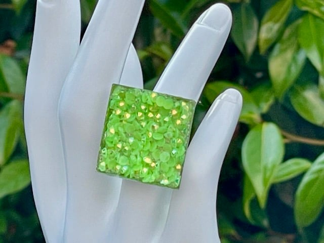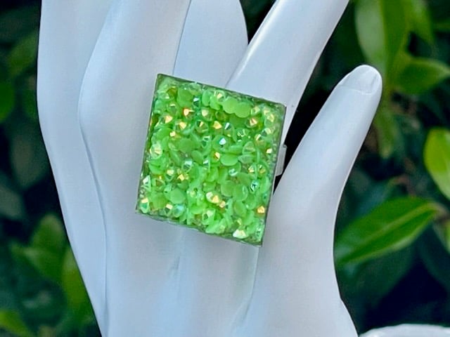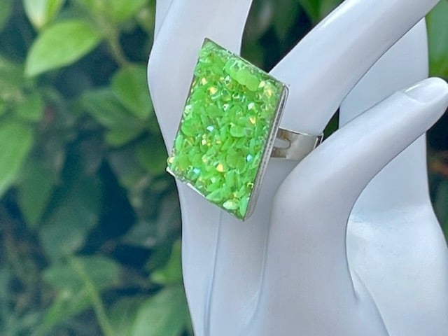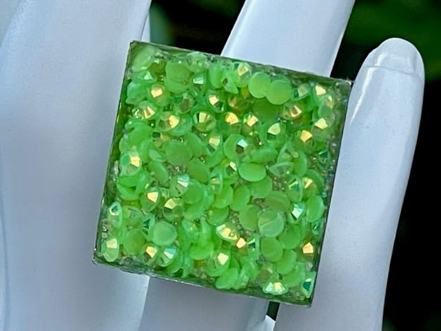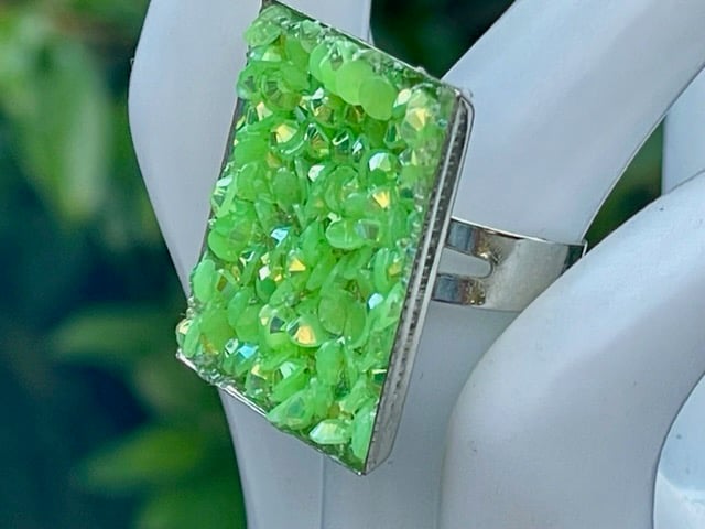 A stunning silver crystal square adjustable ring in a cracker super on trend acid neon green.