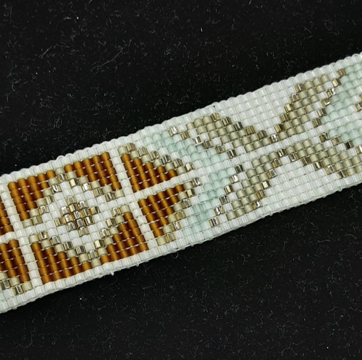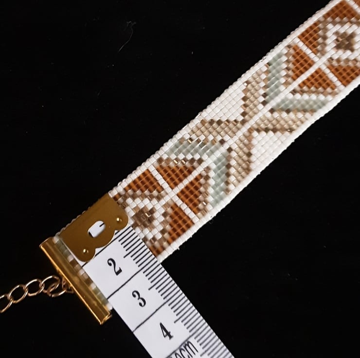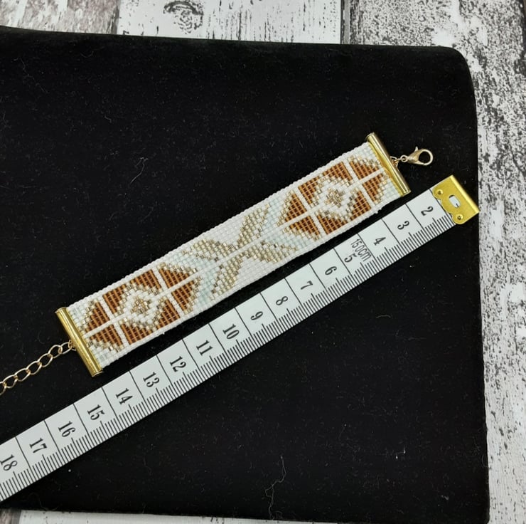 Introducing this stunning handbeaded, geometric patterned loom bracelet. It features miyuki size 11 beads in five colours. Cream ceylon, Matte transparent dark topaz, Silver lined light honey opal, 24kt gold plated hex cut and Pale moss green silk satin. The findings are a complementary gold tone. This bracelet measures 14 x 2.2 cm.