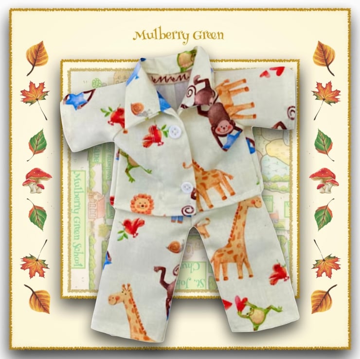 A cute little pair of animal print pyjamas to fit the Mulberry Green characters. The pyjamas are made from cotton and are tailored like real pyjamas. They fasten with poppers under two little buttons.
