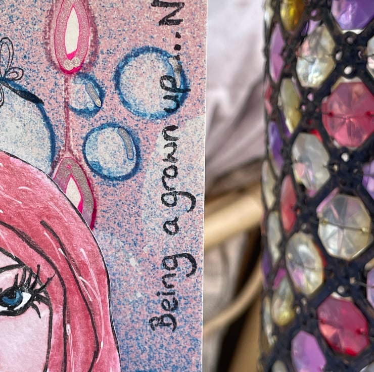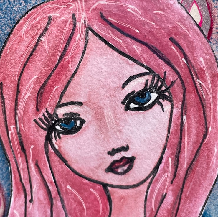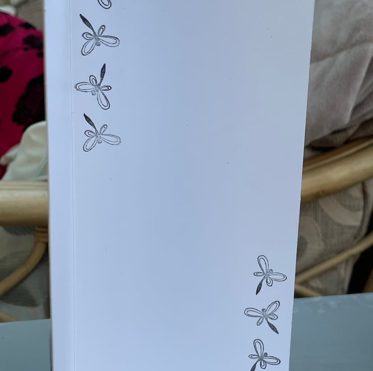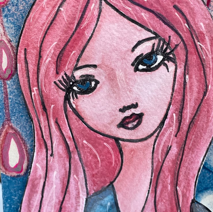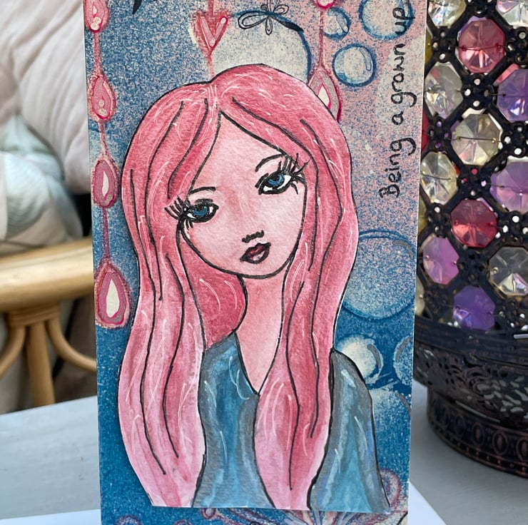 A truly different card to celebrate a birthday. This DL card is modern and different. The background is a layered blue and pink design. It has hearts, teardrops and flowers on a speckled background. This has been enhanced by silver accents. The paper has been stamped with dragonflies. This has a stamped and watercoloured image of a pretty girl with long pink hair. She has been painted with iridescent watercolours in delicate shades of pink and blue. The greeting says 'Being a grown up....No'. Inside the card has more dragonfly stamps but no greeting so it is open to many occasions and greetings. Beautiful and versatile.