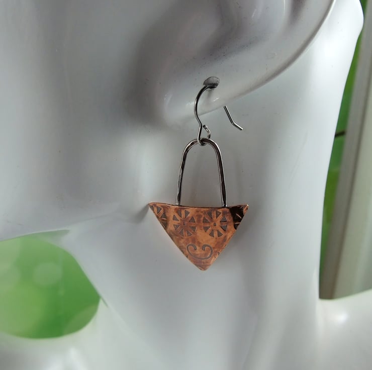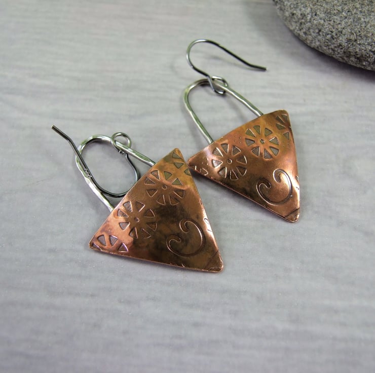 I have created the triangle shapes from copper sheet, hand cut and textured with a geometric pattern. I then slightly domed the shapes and then soldered on shaped silver wire and added ear hooks. The earrings have been given an oxidised finish and polished.