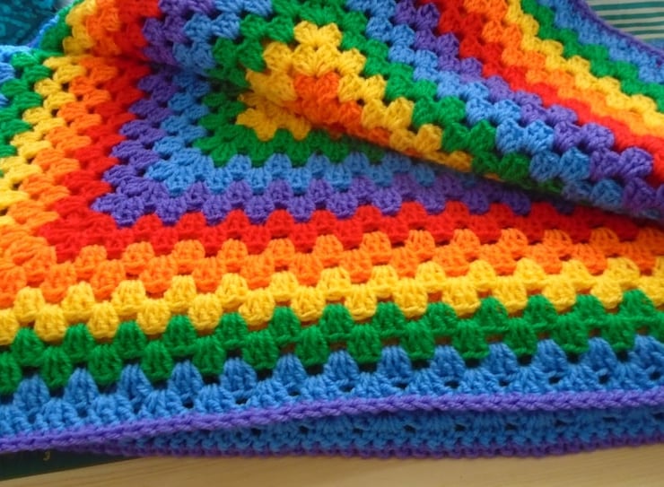 This bright and cheerful rainbow granny square crochet throw will keep you warm and happy on those cooler autumnal evenings. It has been made using acrylic DK yarn and is machine washable. Size 47 x 49 inches.