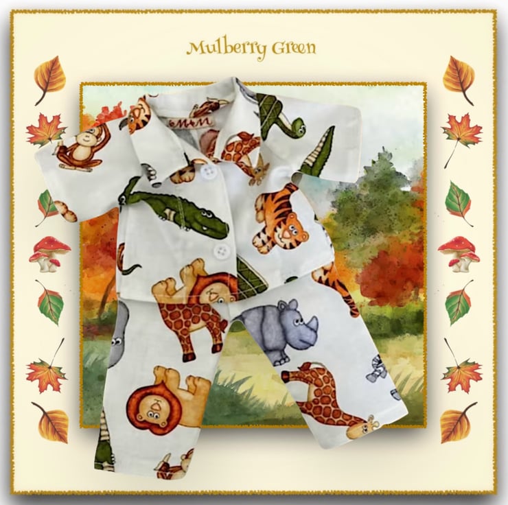 A cute little pair of zoo animal print pyjamas to fit the Mulberry Green characters. The pyjamas are made from cotton and are tailored like real pyjamas. They fasten with poppers under two little buttons.