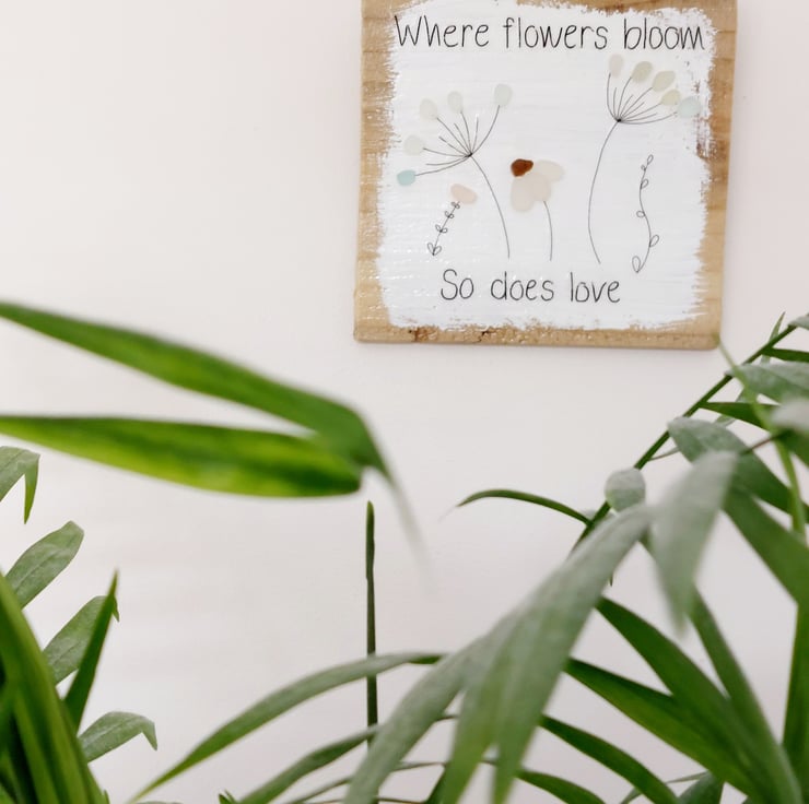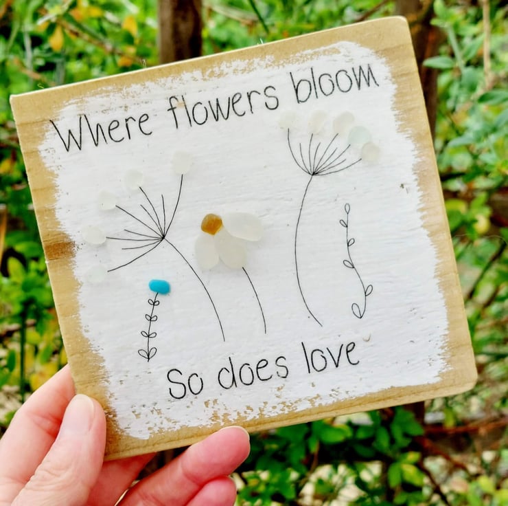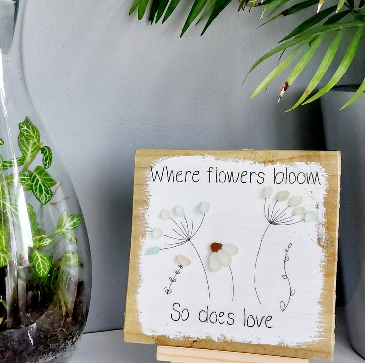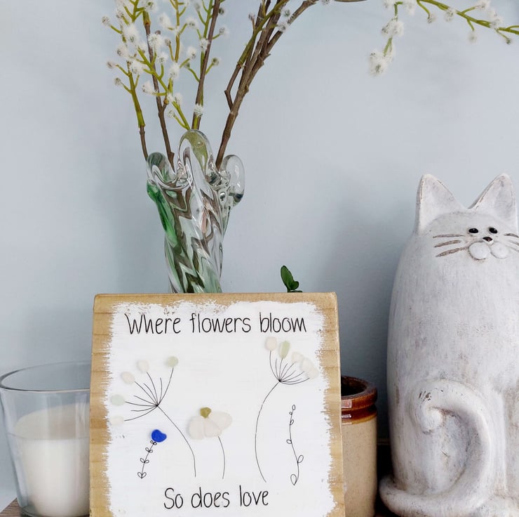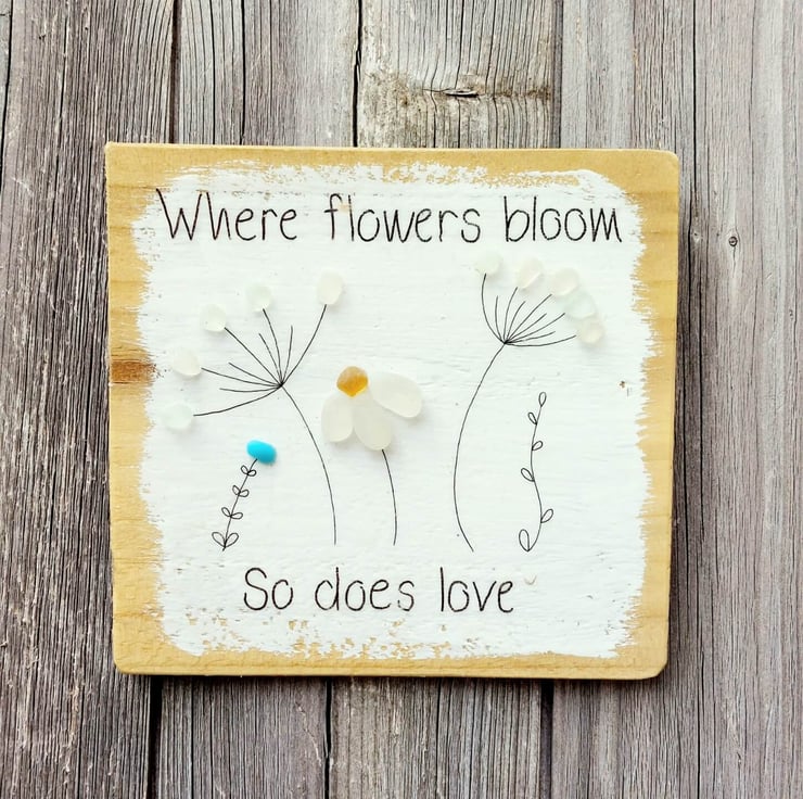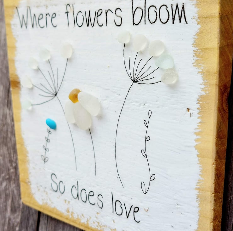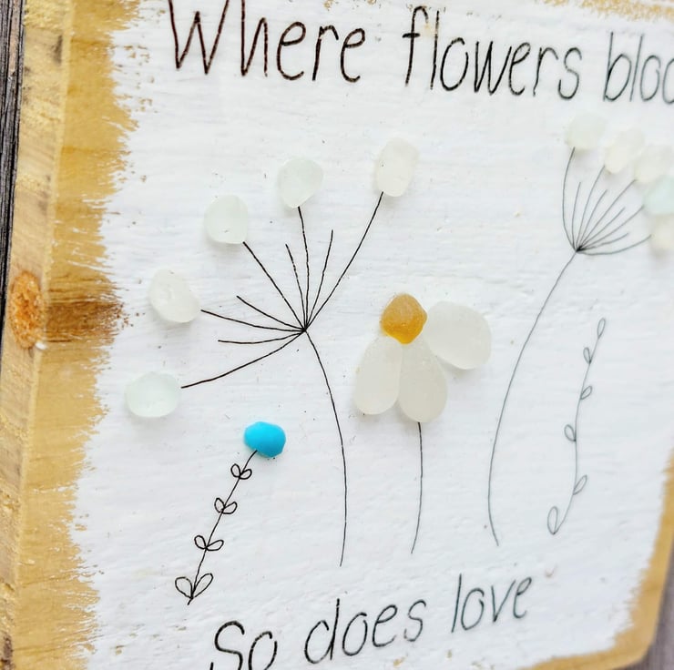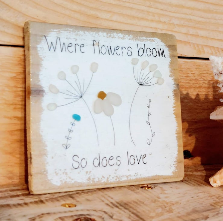 This adorable original piece of artwork has been created using sea glass and reclaimed wood. The backing board is fence panels that have been sanded, cut, painted and embellished by hand. The original design includes a quote reading 'Where flowers bloom, So does love' and shows wild flowers decorated with pieces of naturally tumbled sea glass collected from my beachy travels.