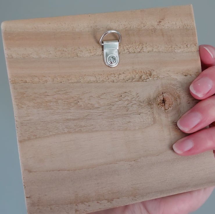 - The piece has been varnished and has a hook attached to the reverse so you can hang it on the wall, you can also choose to purchase a mini easel if you want to display this on a shelf or window sill. The dimensions of the piece are 12.5cm wide by 12cm high and approx 1cm thick.