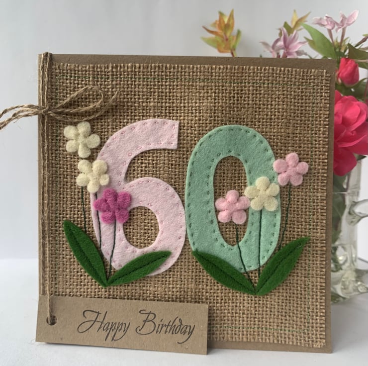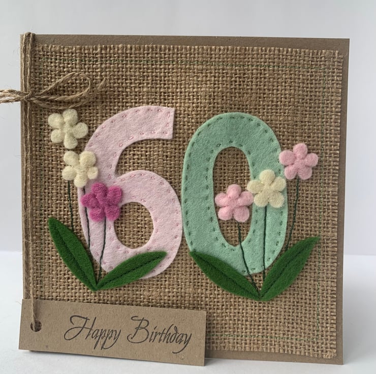 A unique handmade card for a special birthday. The numbers for this 60th birthday card are hand cut from pale pink and mint green acrylic felt and hand sewn to a hessian background. Flowers, hand cut from wool felt, in pale pink, rose pink and cream are added to decorate the card.