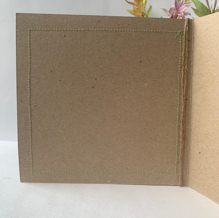 The hessian is machine stitched, using a contrasting thread, onto a plain brown recycled card. This stitching is visible on the inside of the card.