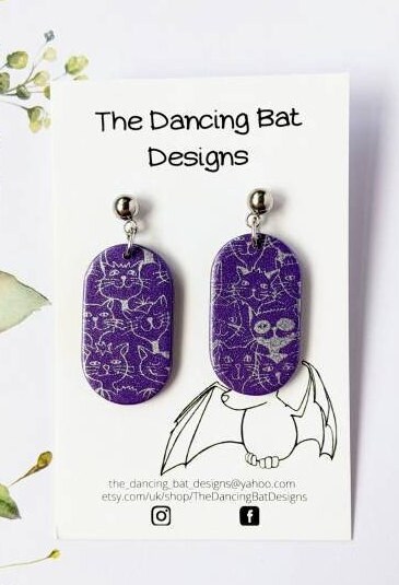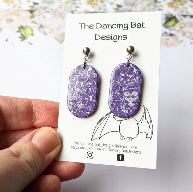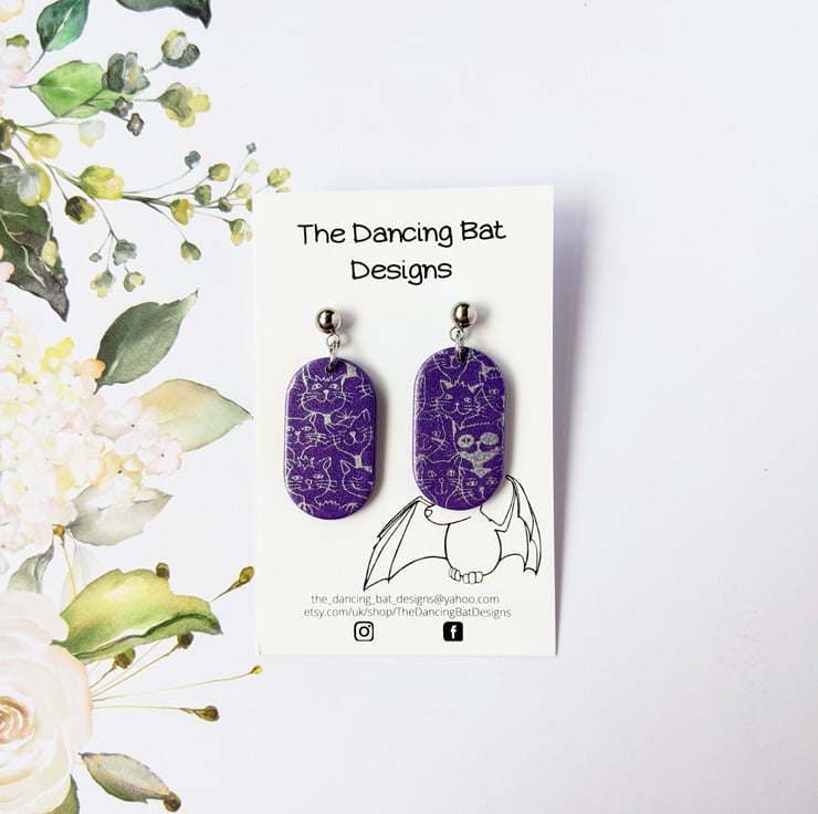 Purple, large pill shape, drop earrings with silver Cheeky Cats design across the front. These dangle drop earrings are made from professional standard Polymer Clay. This makes them very lightweight and comfortable to wear. Hung from surgical steel ball studs, with butterfly backs.
