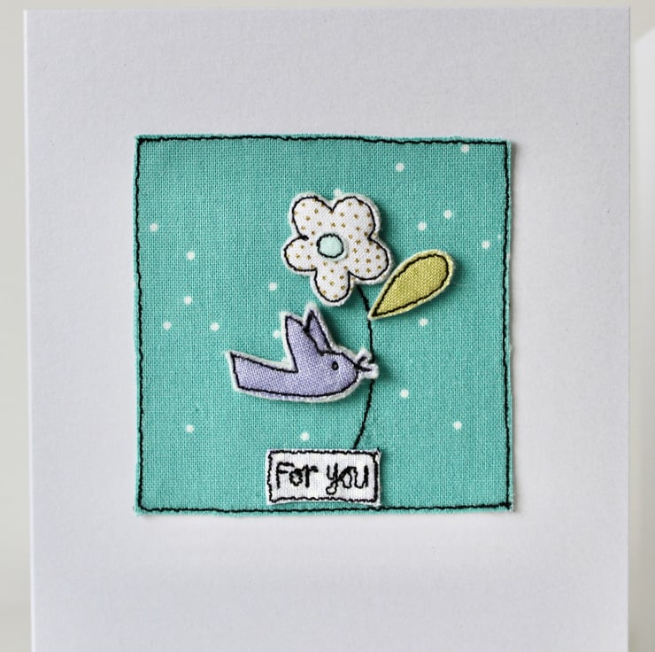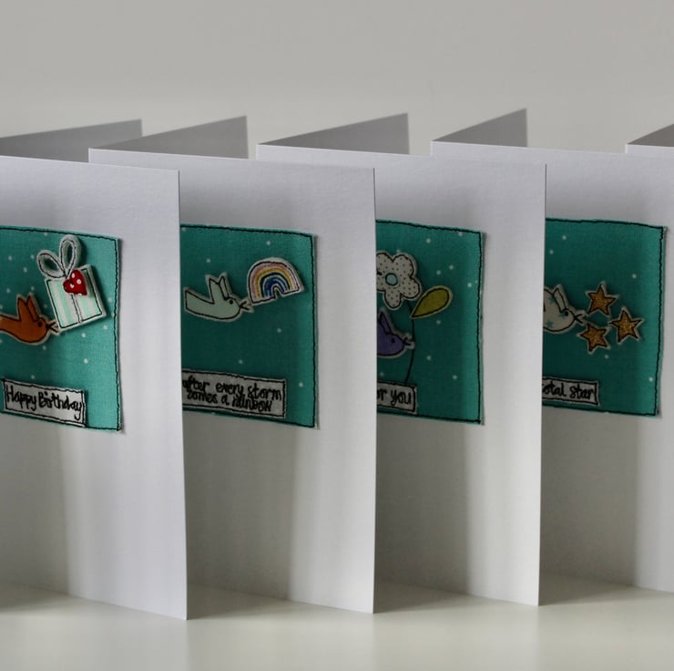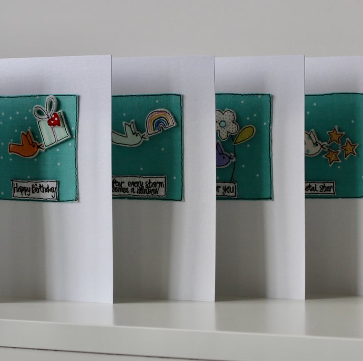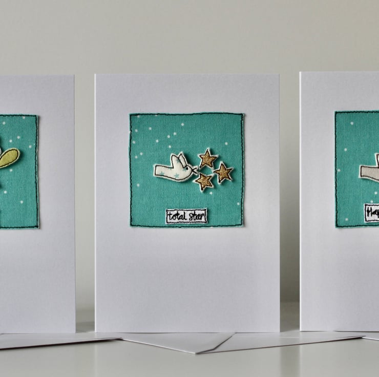 The cards have been sewn by me and my sewing machine, using a mixture of 100% wool felt, cotton cloth, glitter cloth and metallic cloth; making each card totally unique.