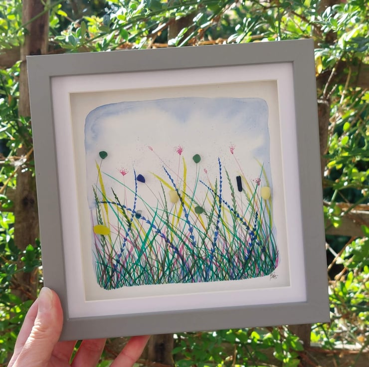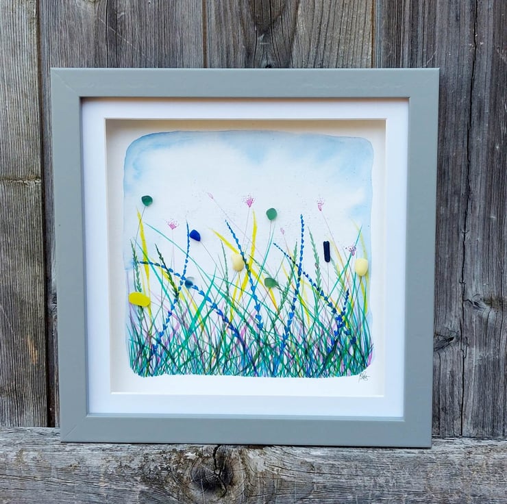 Framed Original Flower Meadow Watercolour Art - Sea Glass Picture, Home Decor