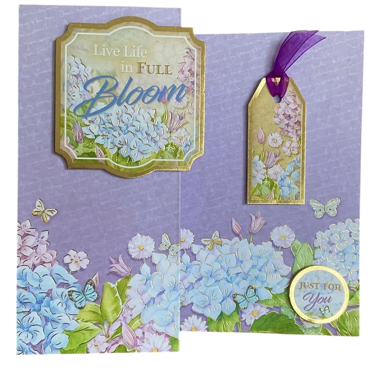 This beautiful purple zigzag card features a background of pink and blue hydrangeas and colourful butterflies.
